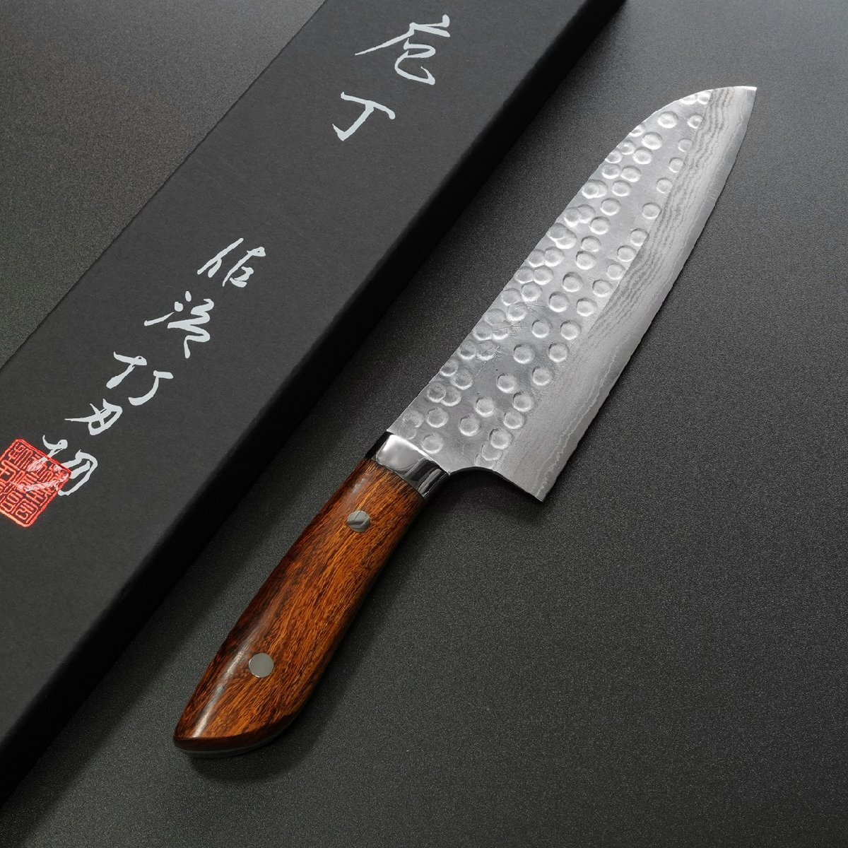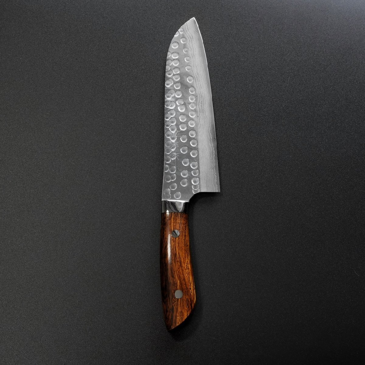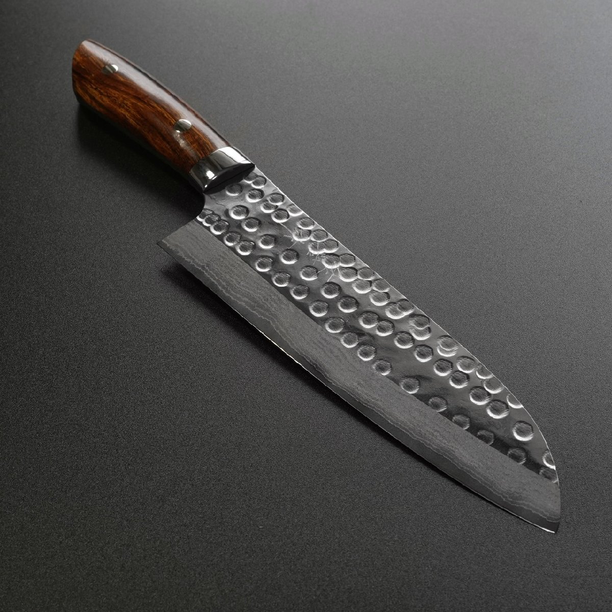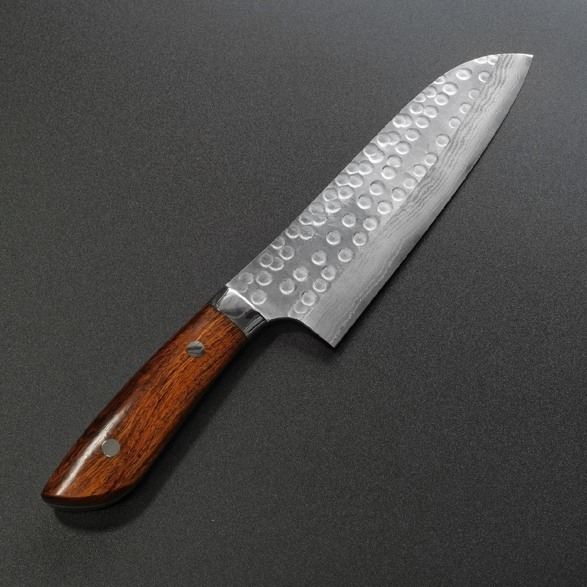 心材の刃は、高硬度、耐摩耗性を高めたSRS13粉末ハイス鋼です。鋼材の青紙スーパーのように炭素を1.50%程度、また耐腐食性のあるモリブデンやバナジウムを高比率で含んでいるため、驚異的な切れ味の持続性と鋭い切れ味があります。またSRS13は錆に強い鋼材です。鋼のように錆に弱くないためメンテナンスも楽になります。そしてハンマーで叩かれた槌目模様が、伝統を感じさせるだけでなく、切った食材を張り付きにくくします。