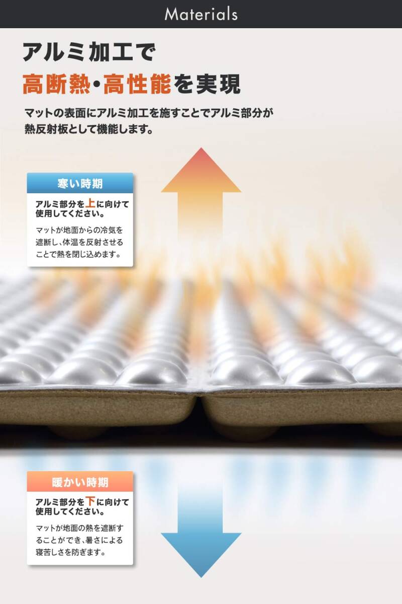 【アルミ加工により冬でもお尻に寒さを感じない】銀面のアルミがお尻の熱を照り返し、裏面が冷気を通しにくいため暖かい座り心地です。