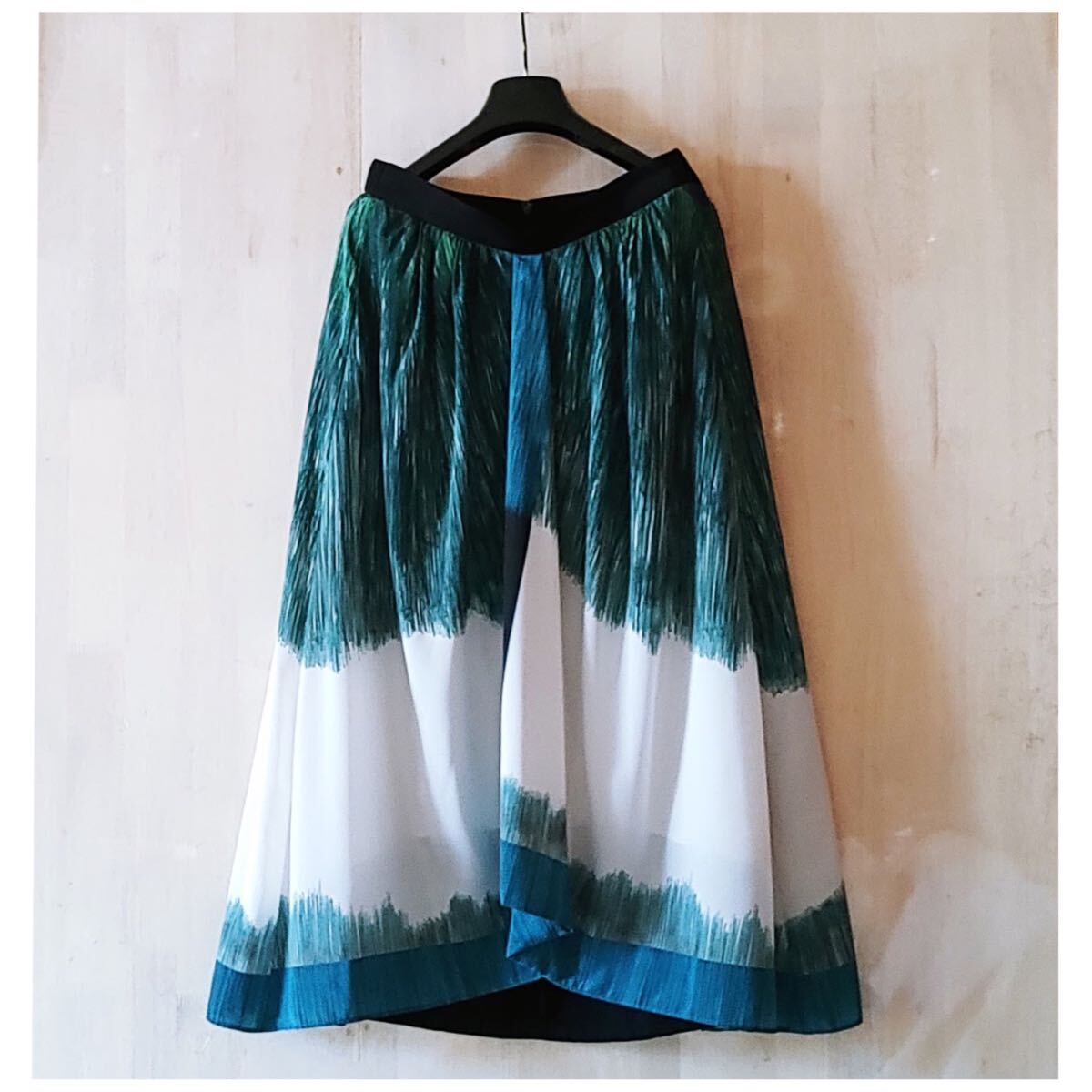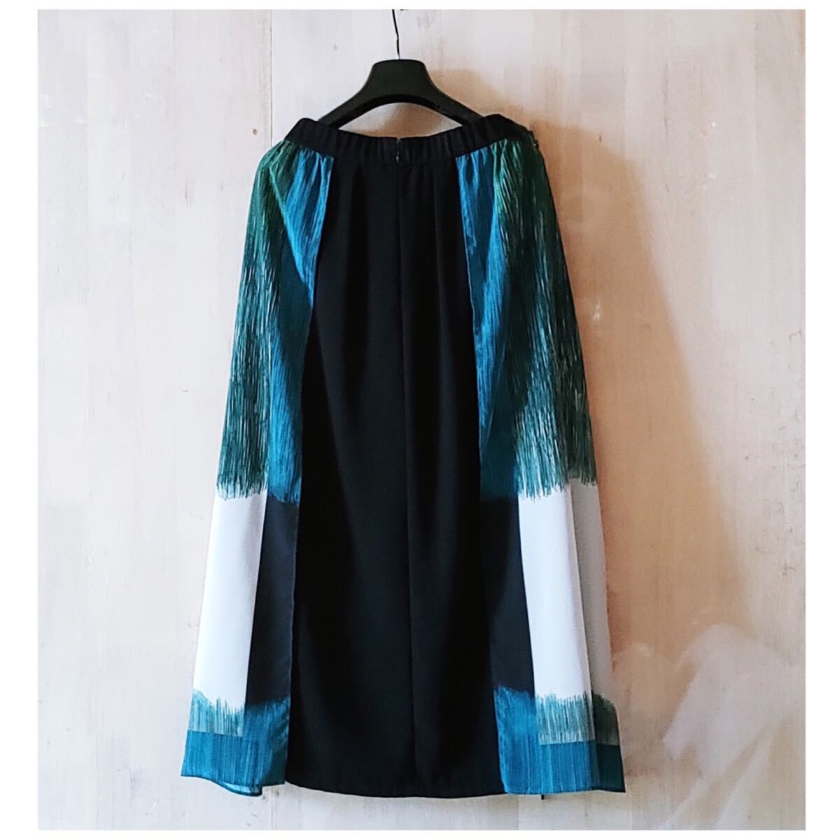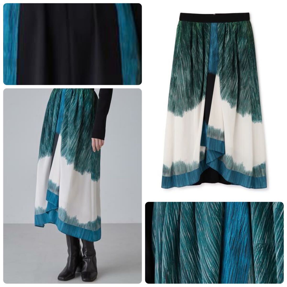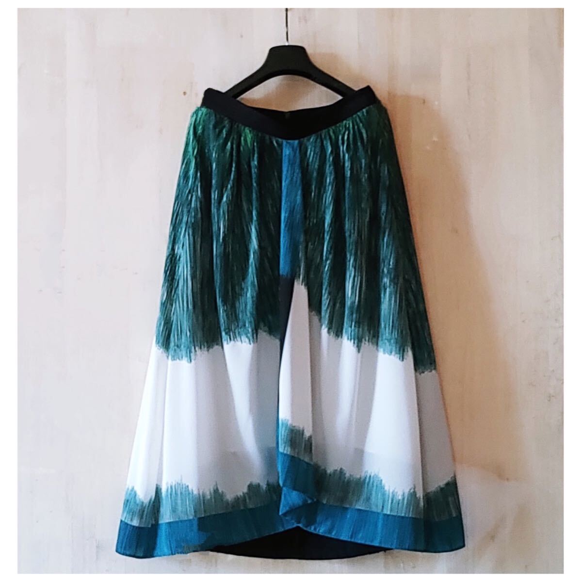 グリーングラデーションのパネルプリントを活かした、前後でデザインの異なるスカートです。