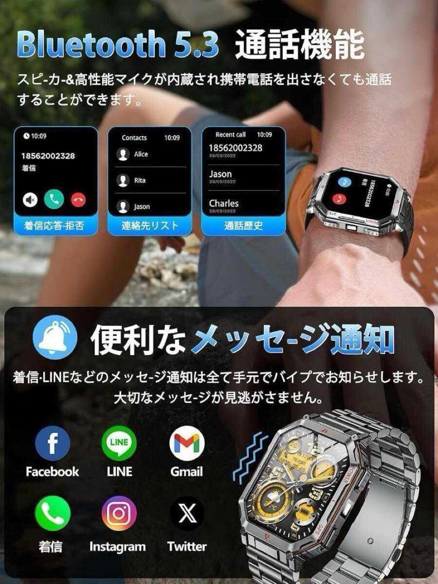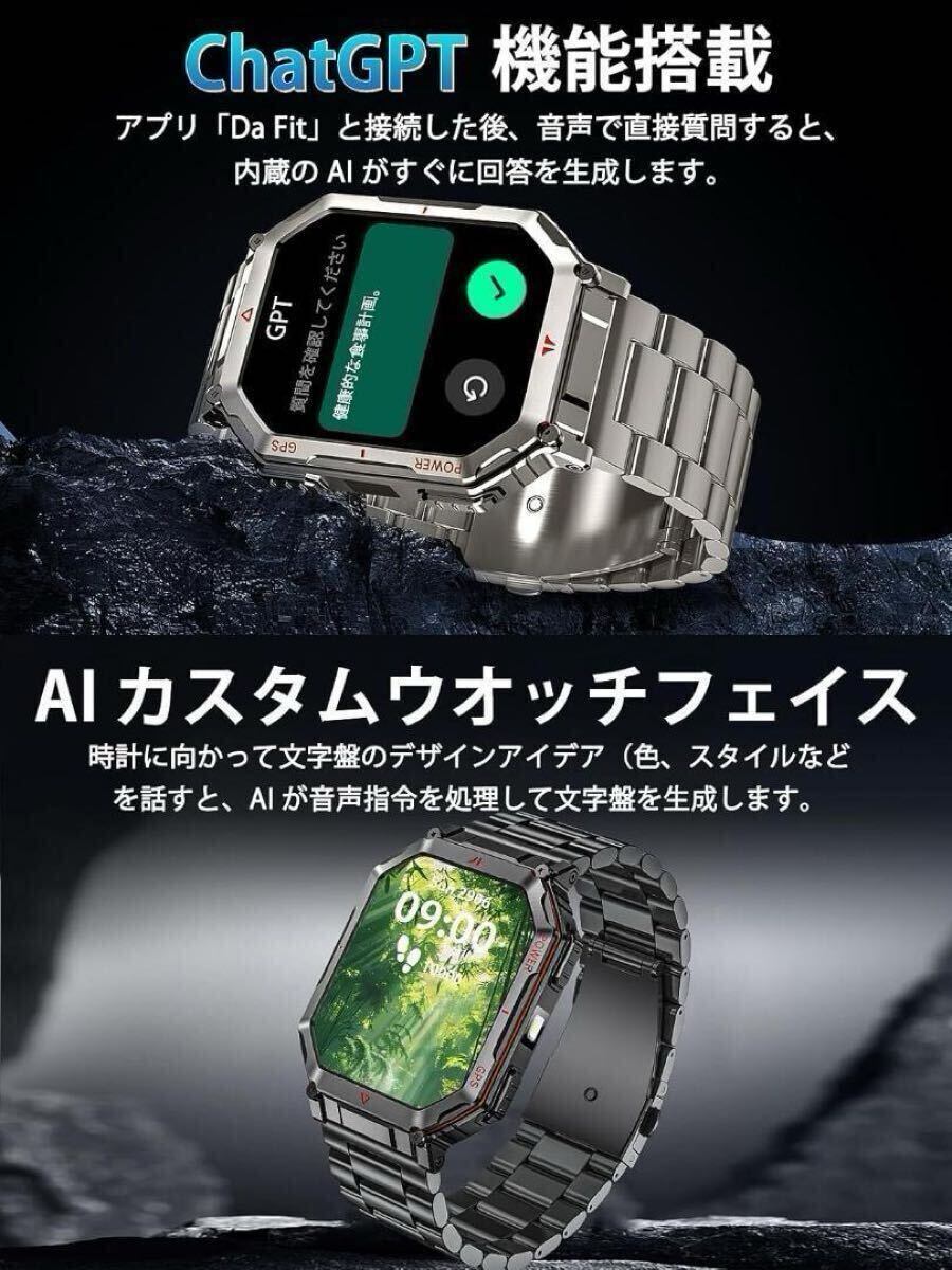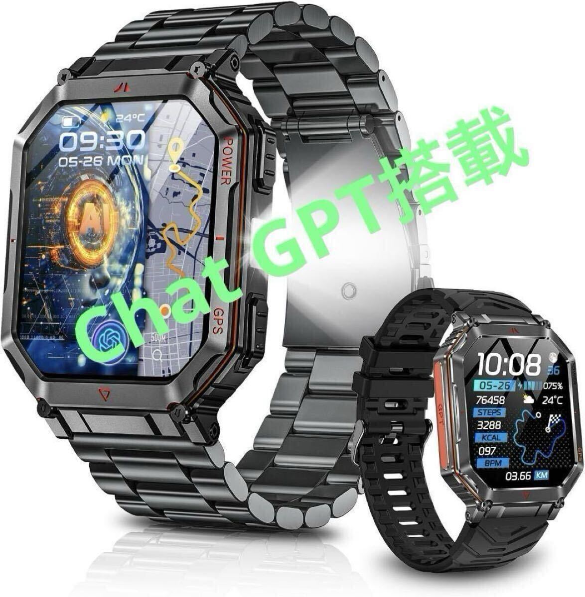 スマートウォッチ【2025最新型 ChatGPT搭載 内蔵GPS 2種バンド付き】AI文字盤 Bluetooth5.3通話 LINE/メッセージ通知 振動と着信音設定 防塵防水 100+運動モード GPS運動記録 高輝度懐中電灯 2.01インチ大画面 スポーツウォッチ 3ATM防水 腕時計 歩数計 遠隔撮影 音楽制御 天気予報 iPhone/アンドロイド対応(ブラック)