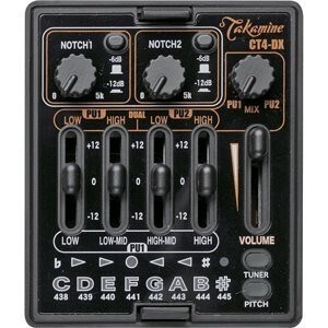 世界中のトップ・プロから認められているタカミネ・オリジナル・ブリッジピックアップ"パラスティック"に加え、任意のピックアップを接続するデュアル・モードを搭載。2系統のEQとノッチフィルターにより、それぞれのピックアップの個性を最大限に活かしたイコライジングと任意のミックス・バランス調整により、今までに無いフレキシブルなサウンドを提供します。通常の1ピックアップ・モードでは2グループのEQをリンクさせ4ポイントEQ&ノッチフィルター×2というプロ用PAコンソールにも匹敵するコントロールが可能となります。