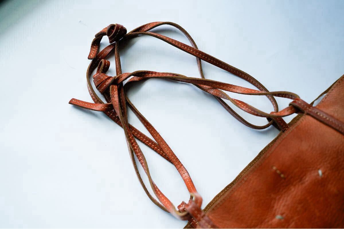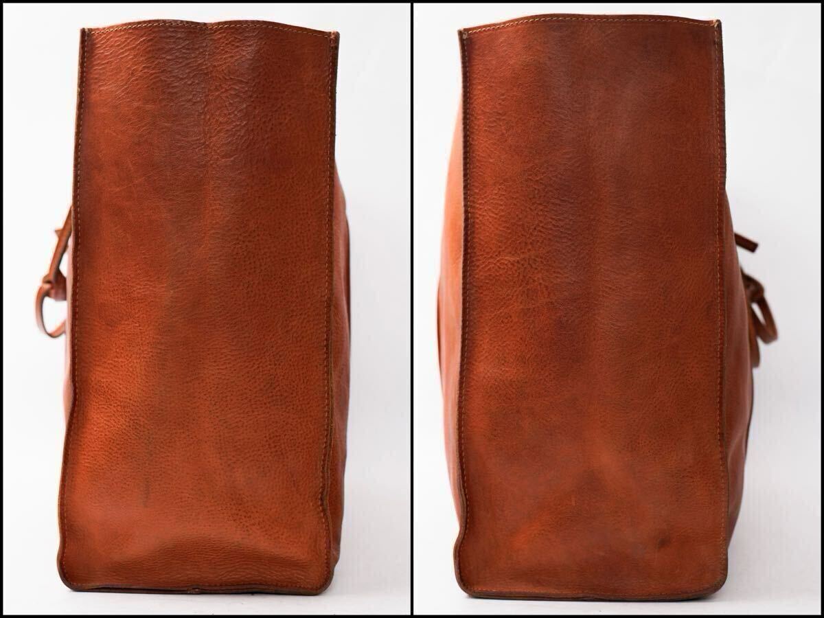 肉厚で柔らかなナチュラルレザーを贅沢に使用し、使い込むほどに艶と深みが増していく経年変化が魅力です。素朴な風合いと大胆なサイズ感が融合し、現代のラグジュアリーでは得難い存在感を放っています。