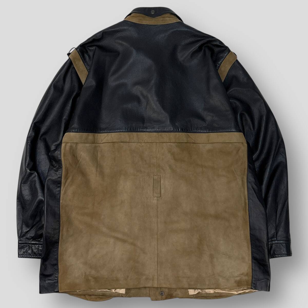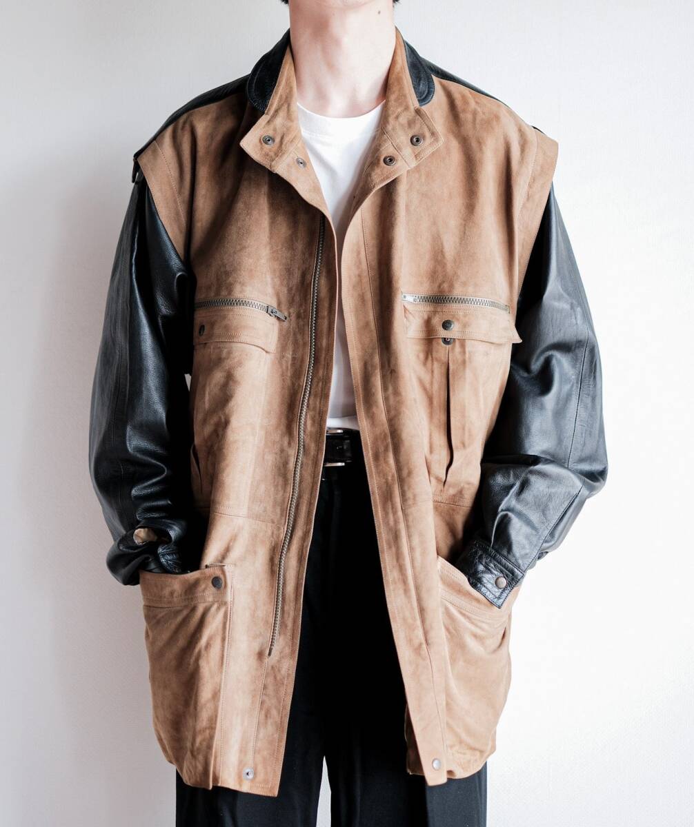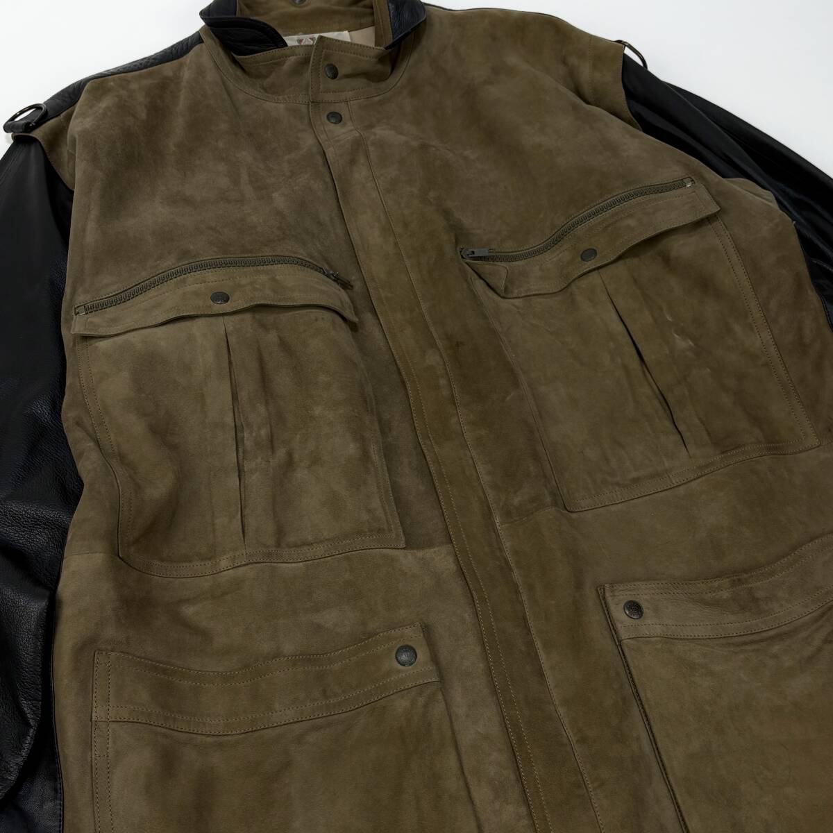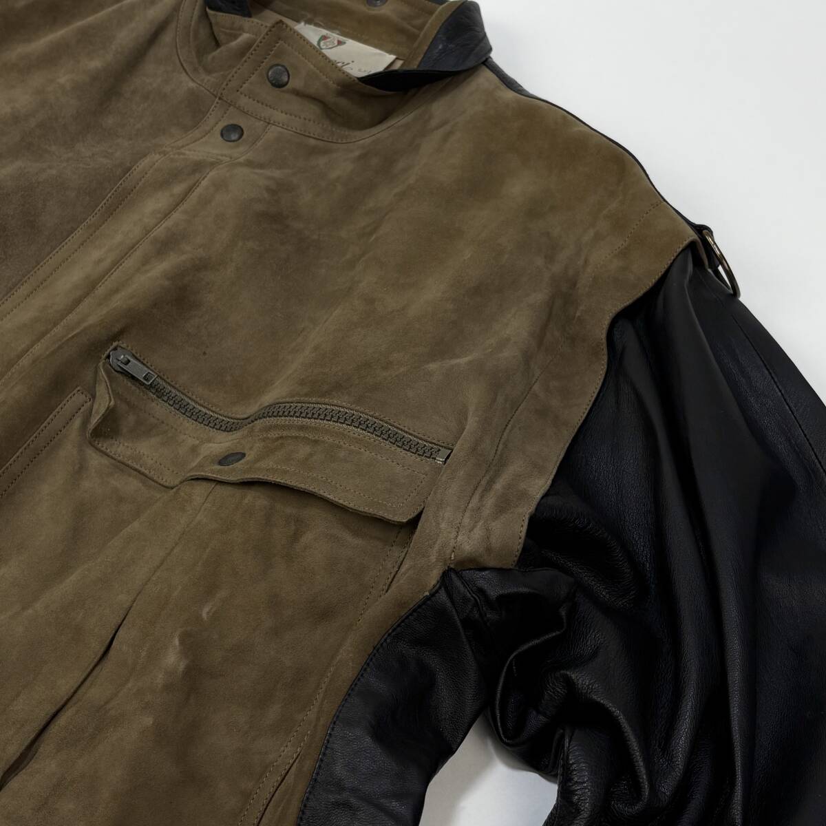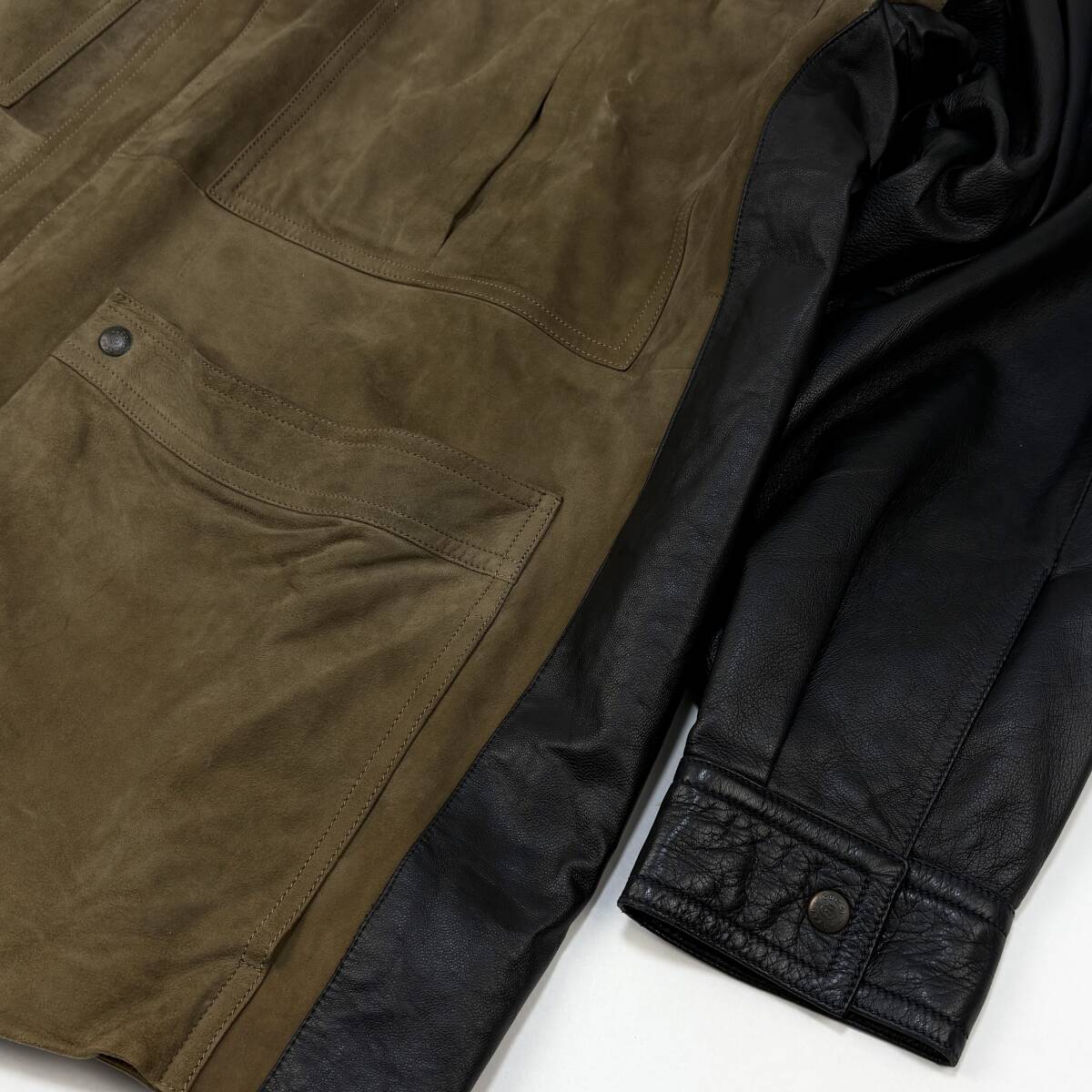 前身頃には滑らかなスエード、襟、袖、背面には光沢感のある表革を使用した2トーン仕様のデザイン。