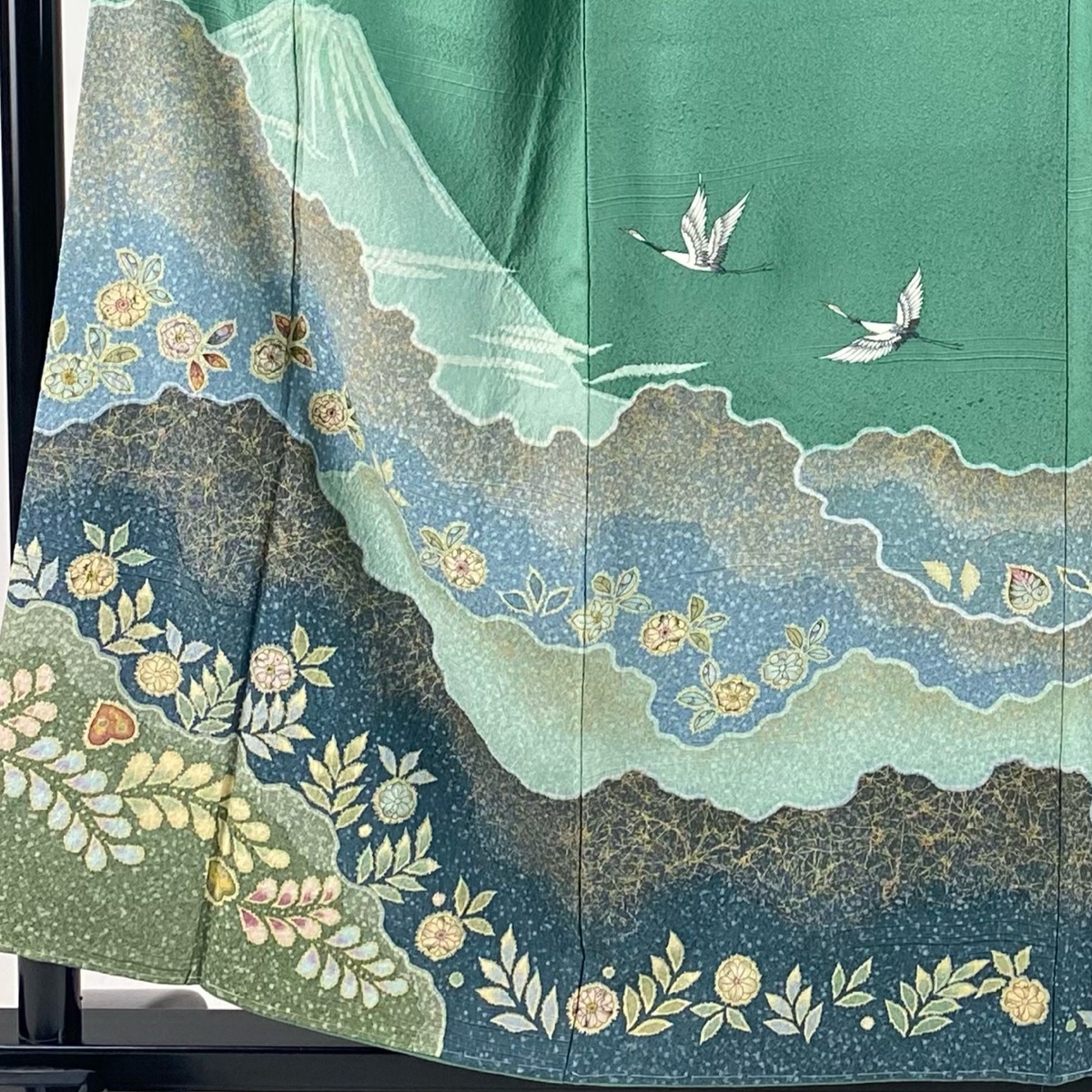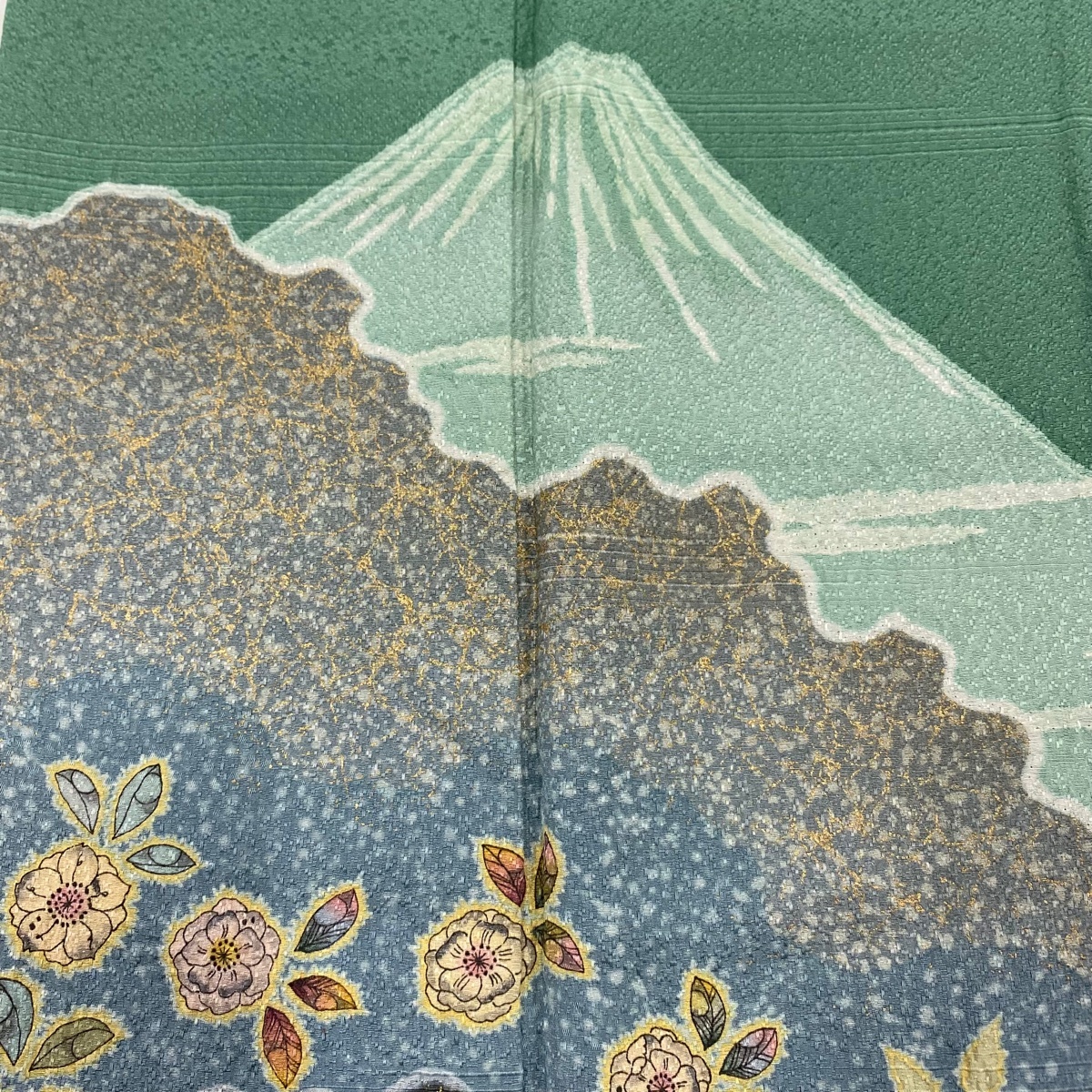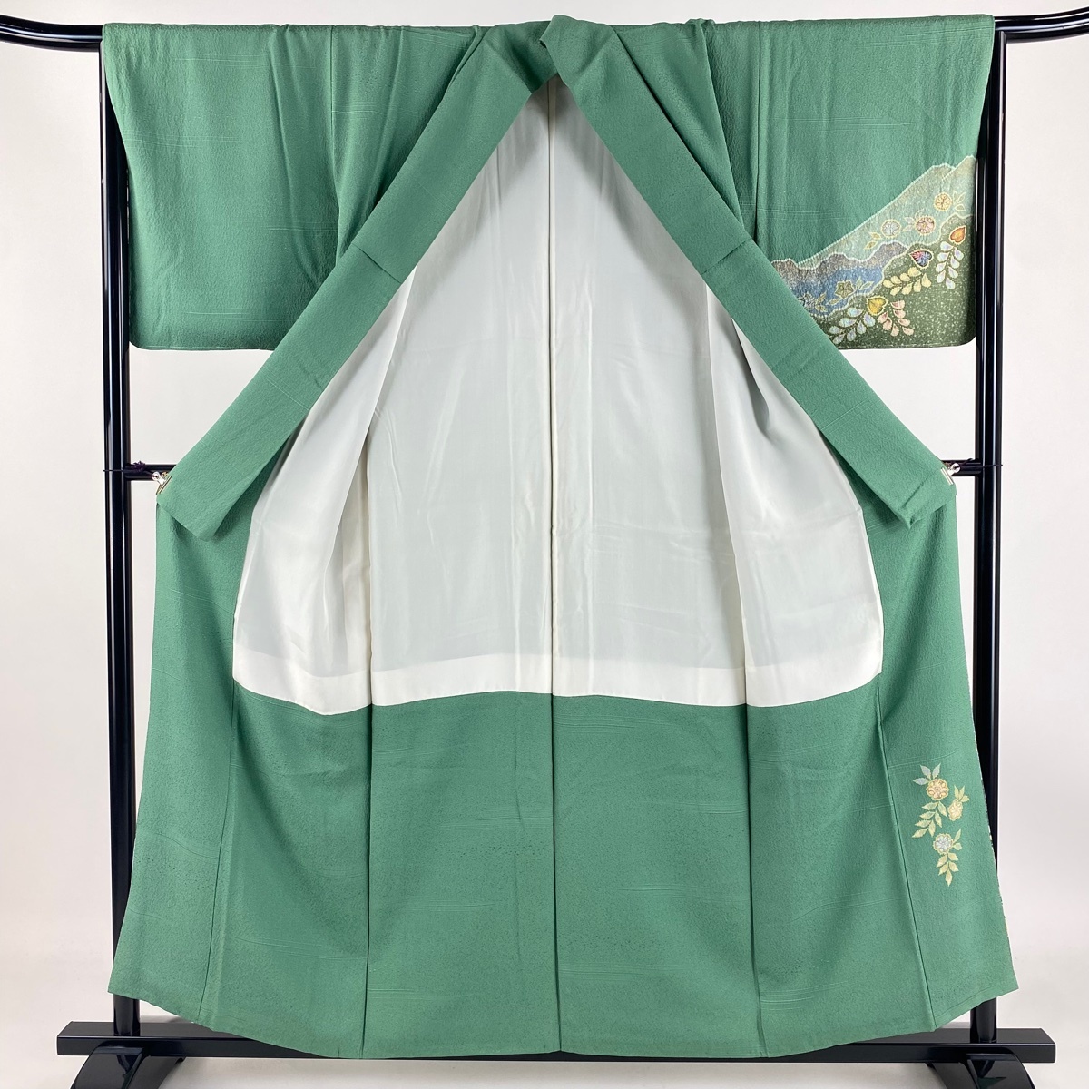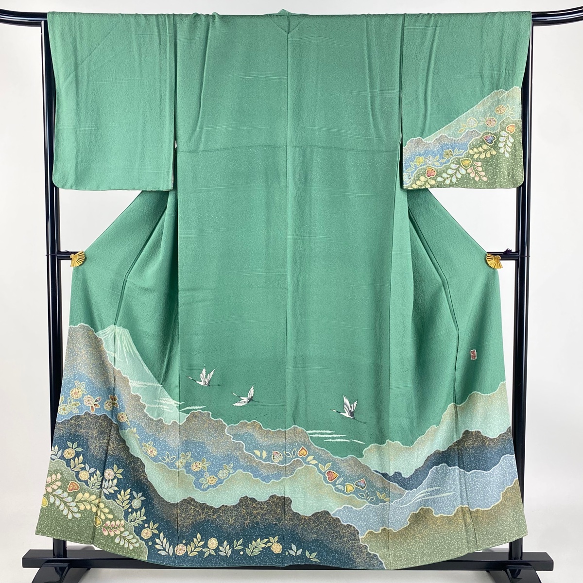 | 付下げ 名品 落款 山 草花 金彩 薄緑 袷 身丈157 裄丈64.5 M 正絹 【中古】 |