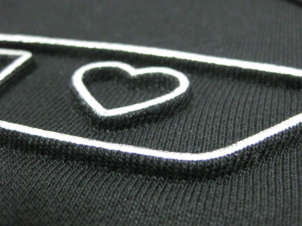 浮き上がったロゴの上面にだけシルバー箔プリントを施しています。
