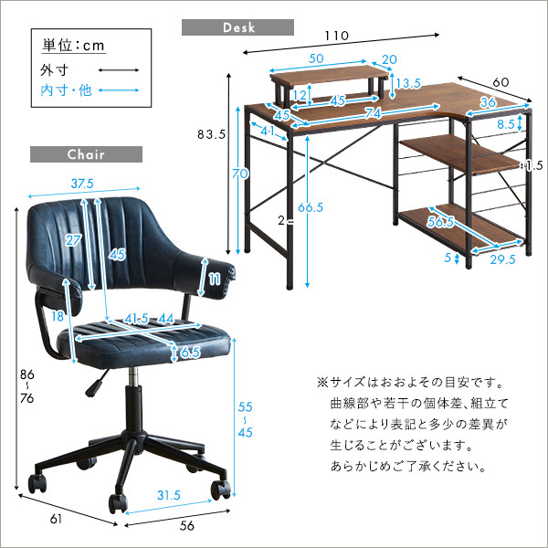 チェア:W56×D61×H76〜86(SH45〜55)cm