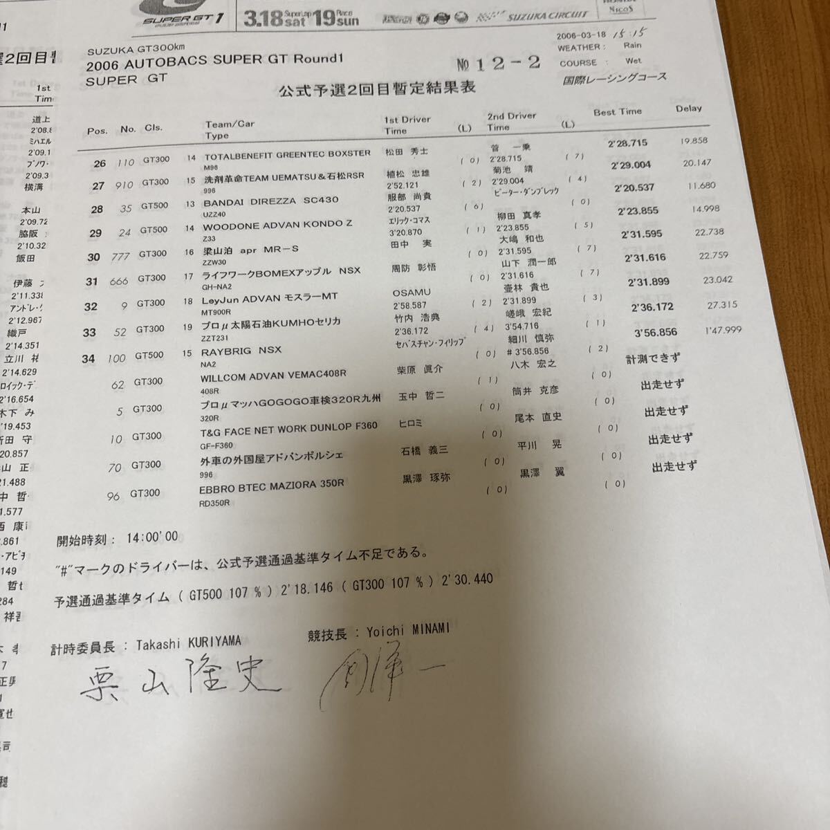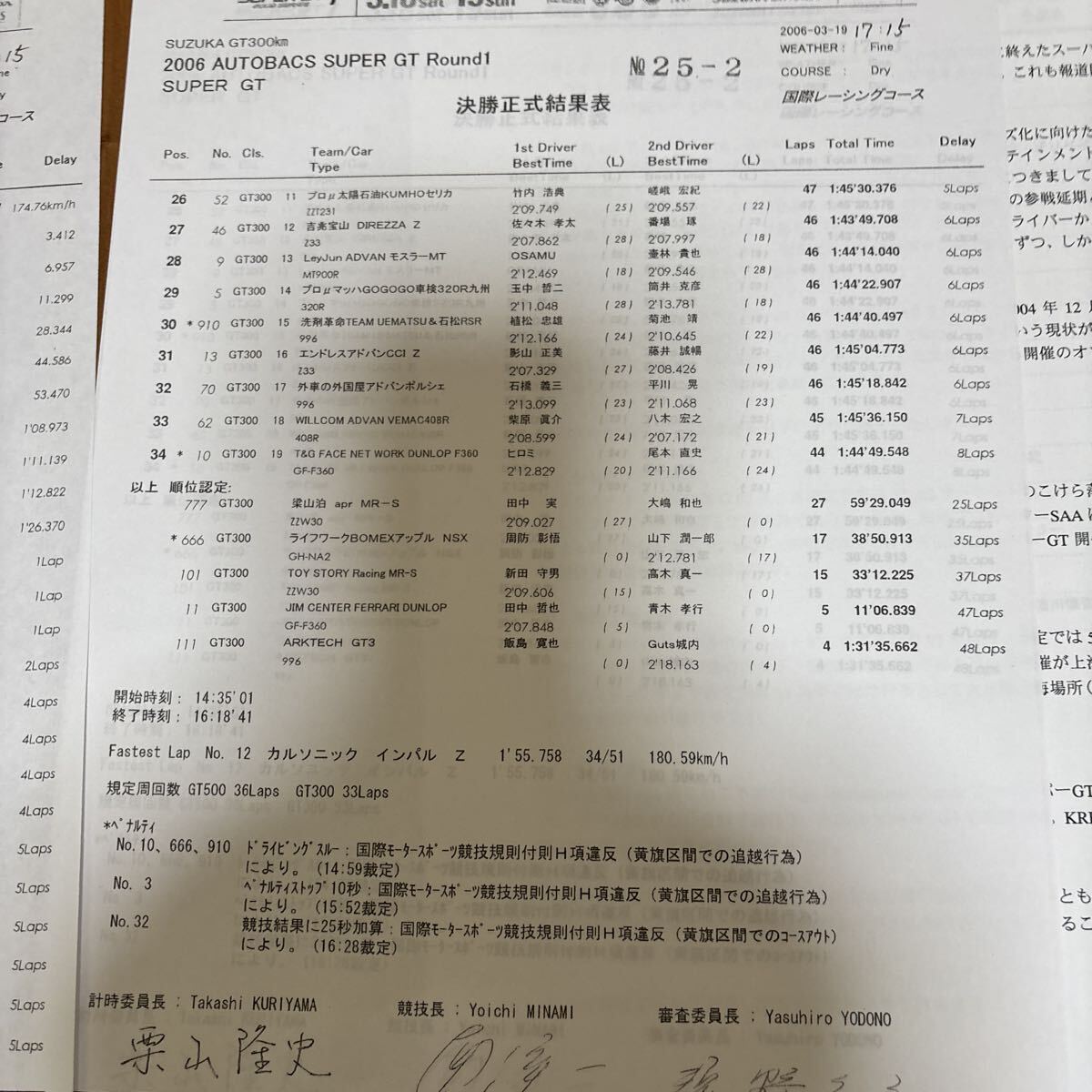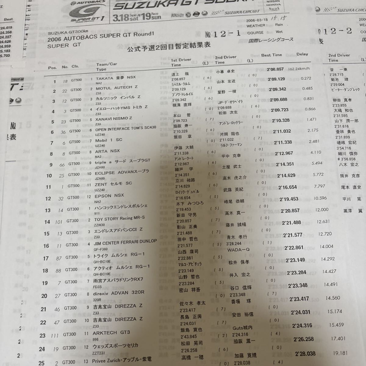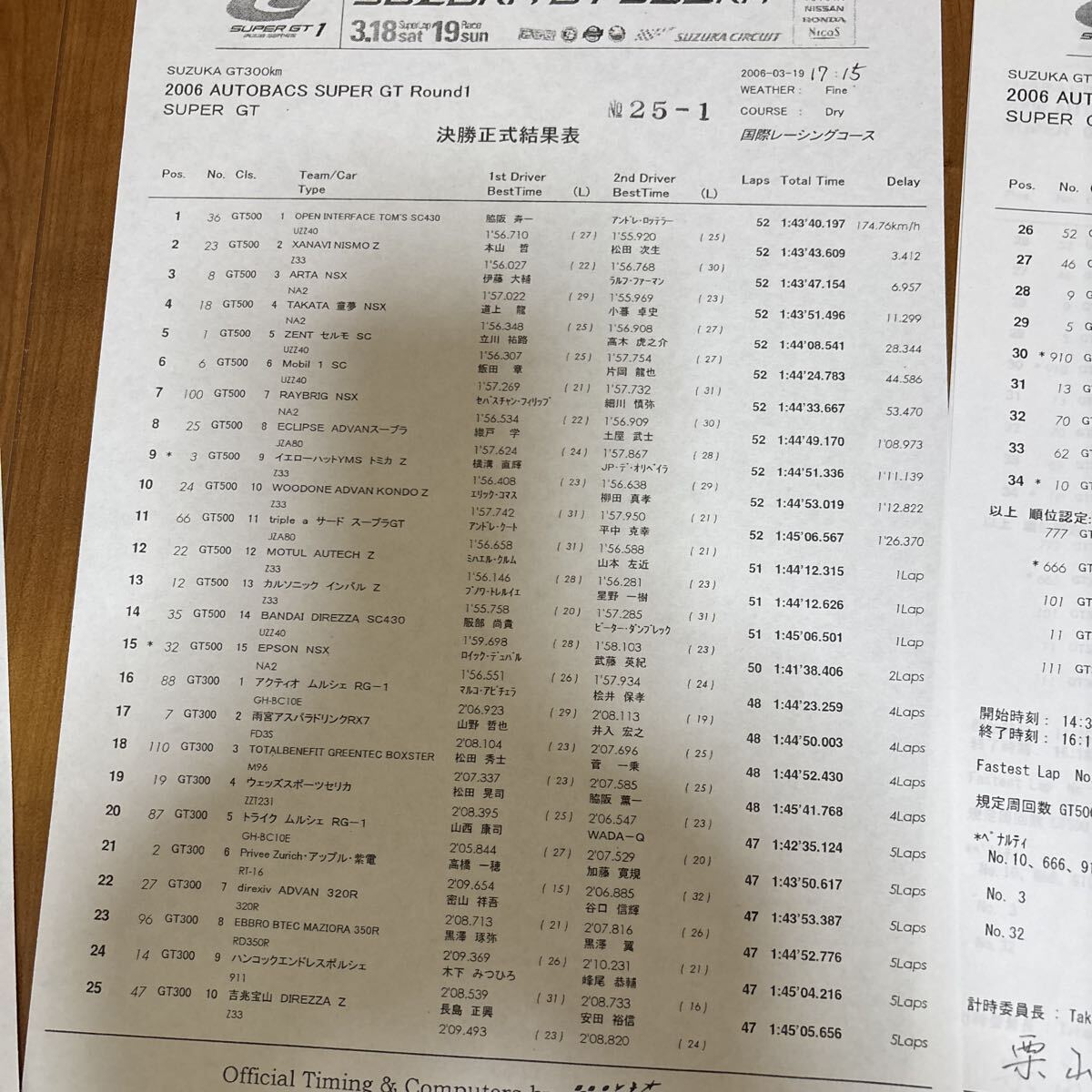 2006年スーパーGTラウンド1 SUZUKA GT 300kmレースのリザルトになります。