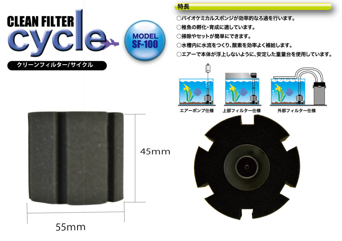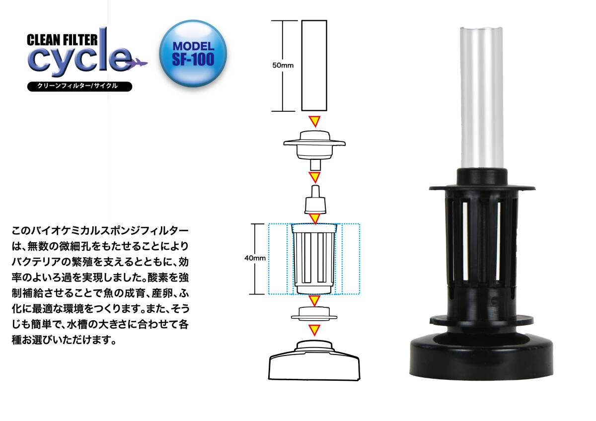 ●スポンジフィルターサイクルは、バイオケミカルスポンジにより効率的なろ過を行えるフィルターです。