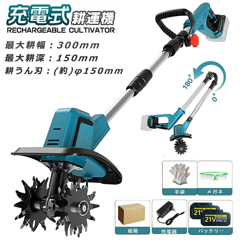 電動耕運機 充電式 小型 家庭用 電動耕うん機 バッテリー2個 コードレス 4枚刃 強力 ハイパワー マキタバッテリー併用菜園 農機具幅225mm