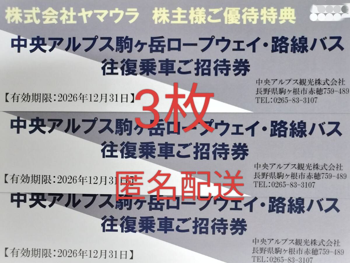 ヤマウラ 株主優待 中央アルプス駒ケ岳ロープウェイ 路線バス 往復乗車券 3枚
