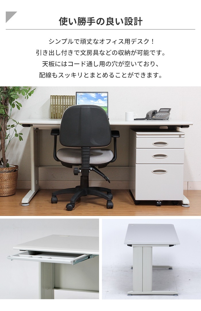 | シンプルで頑丈なオフィス用デスク。 引き出し付きで文房具などの収納が可能です。 天板にはコード通し用の穴が空いており、配線もスッキリとまとめることができます。 |