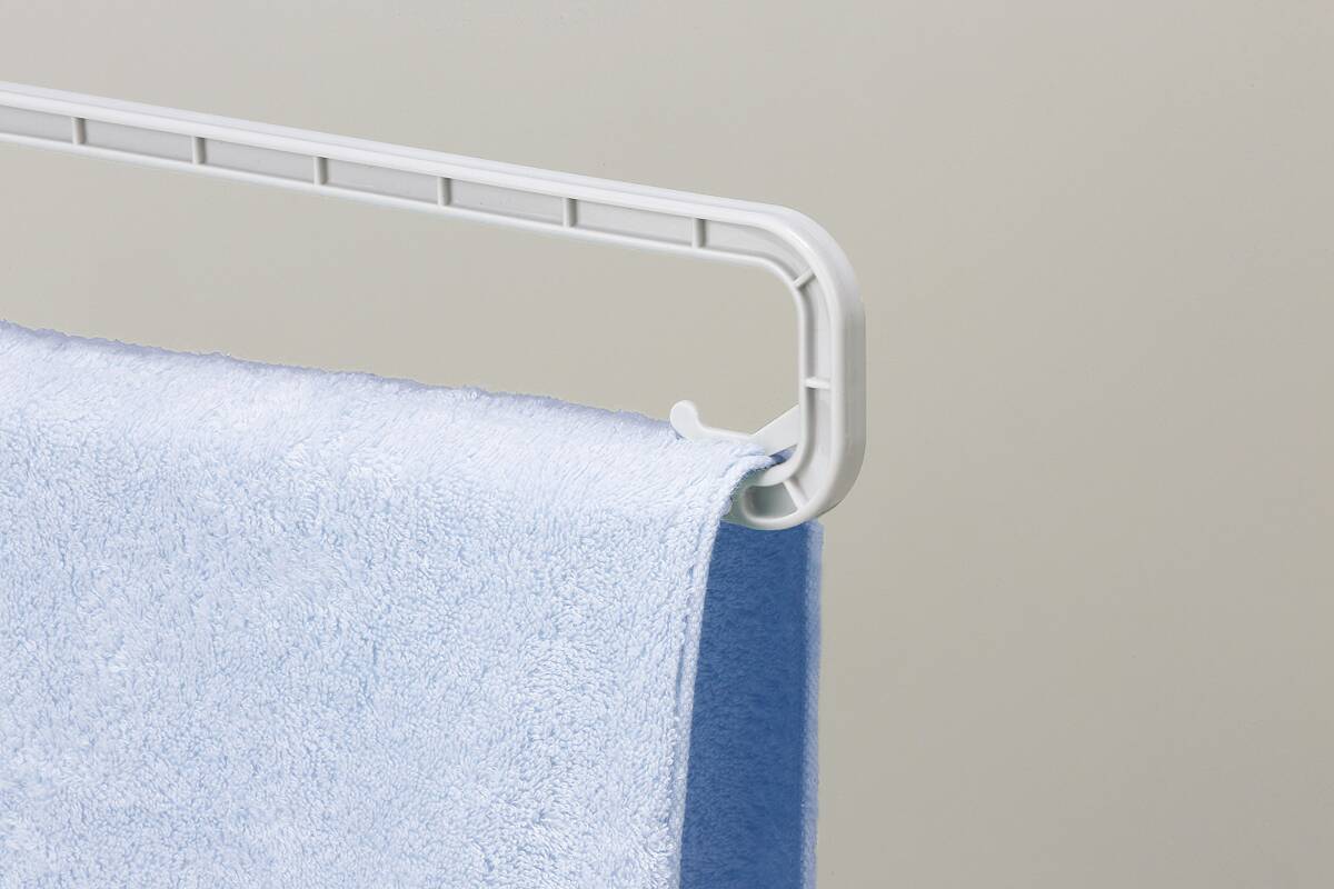説明 広げて干すだけの簡単バスタオルハンガーです。 くっつき防止アーム付なのでバスタオルがくっつかず乾きが早くなります。 バスタオルを固定するフック付きです。