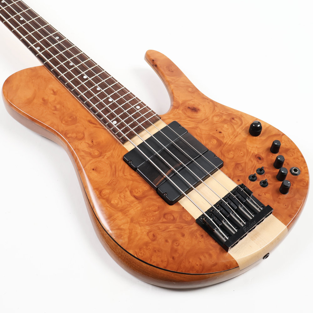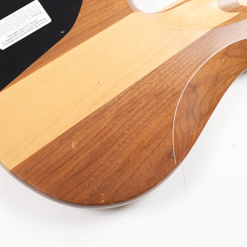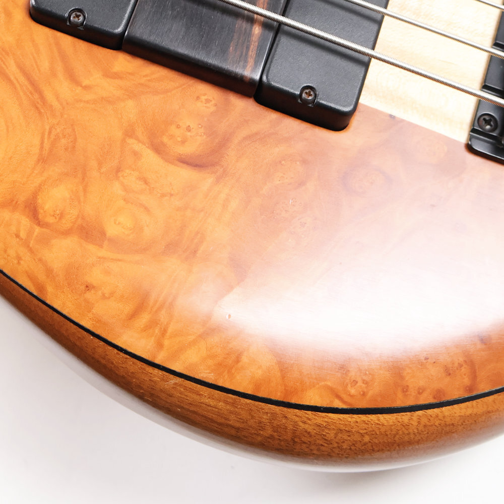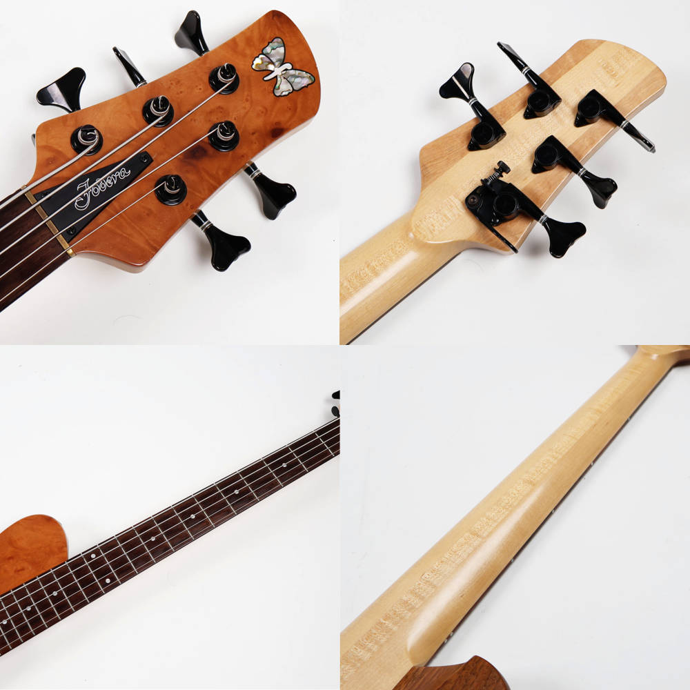 ウォルナットボディにマドローナバールトップ、メイプル3pのスルーネックにマダガスカルキングウッド指板を採用しています。