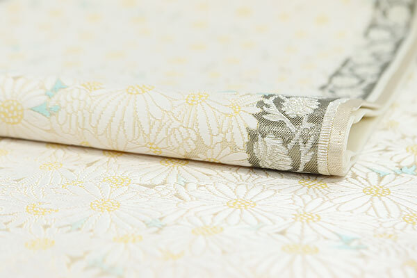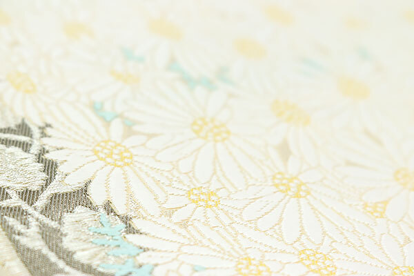 白色、卵色、白緑色などのお色目で、菊文が敷き詰められるように織り上げられております。