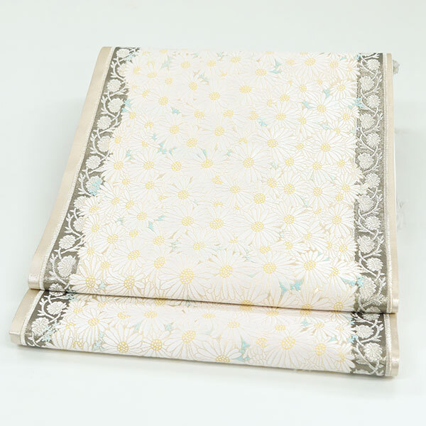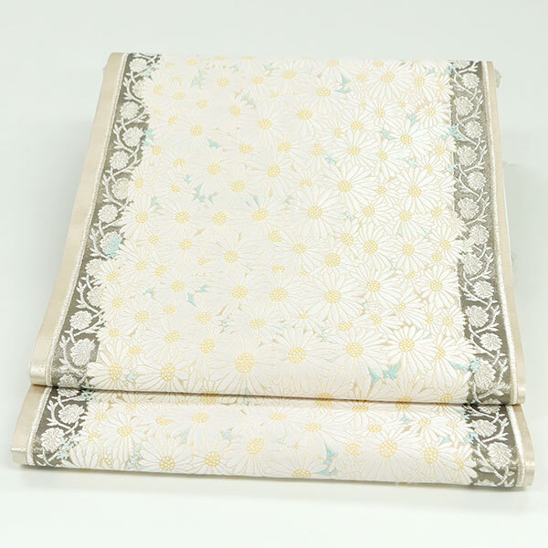 「献上春菊文」と題されたしなやかなこちらのお品は、清楚な白色、シルバーのお色目でございます。