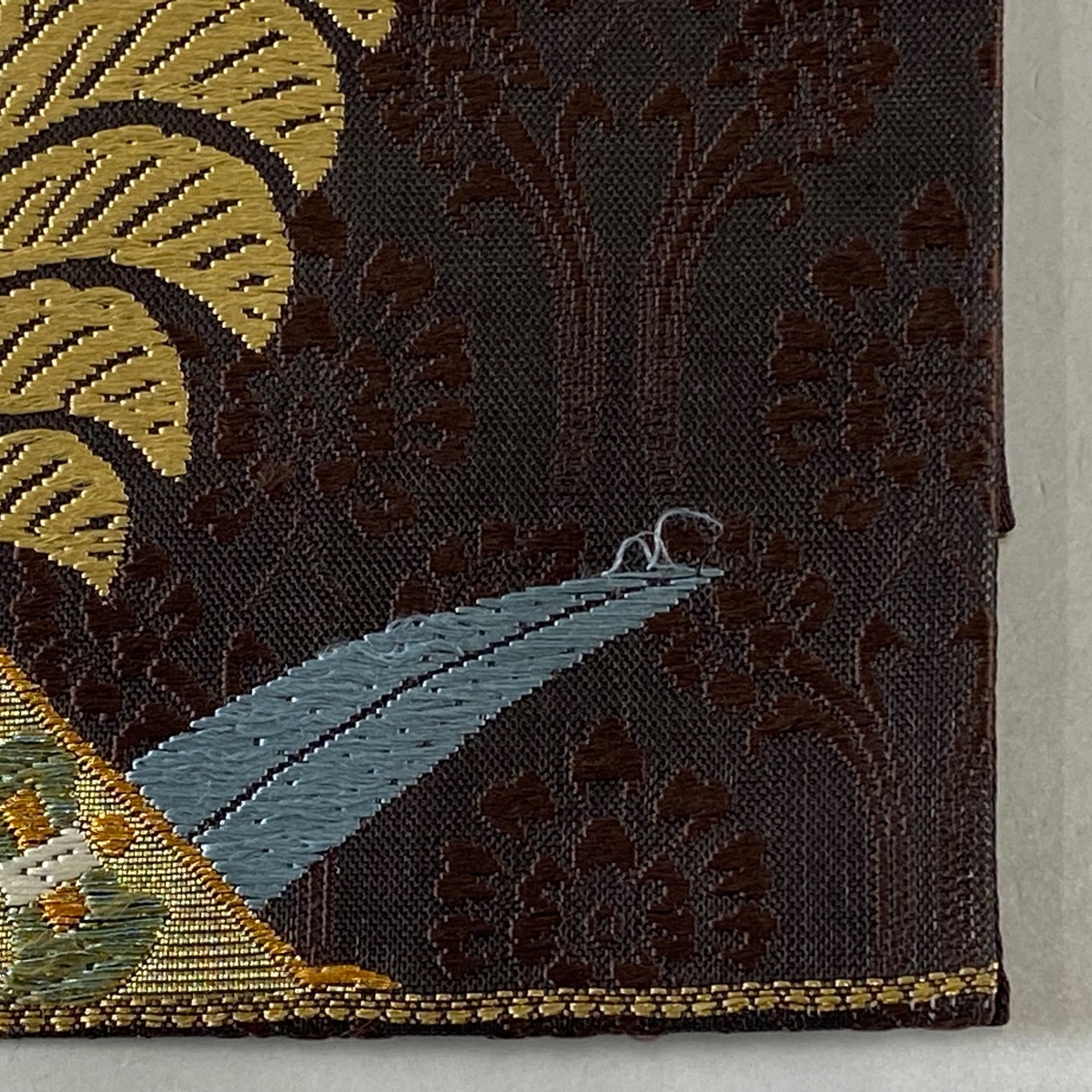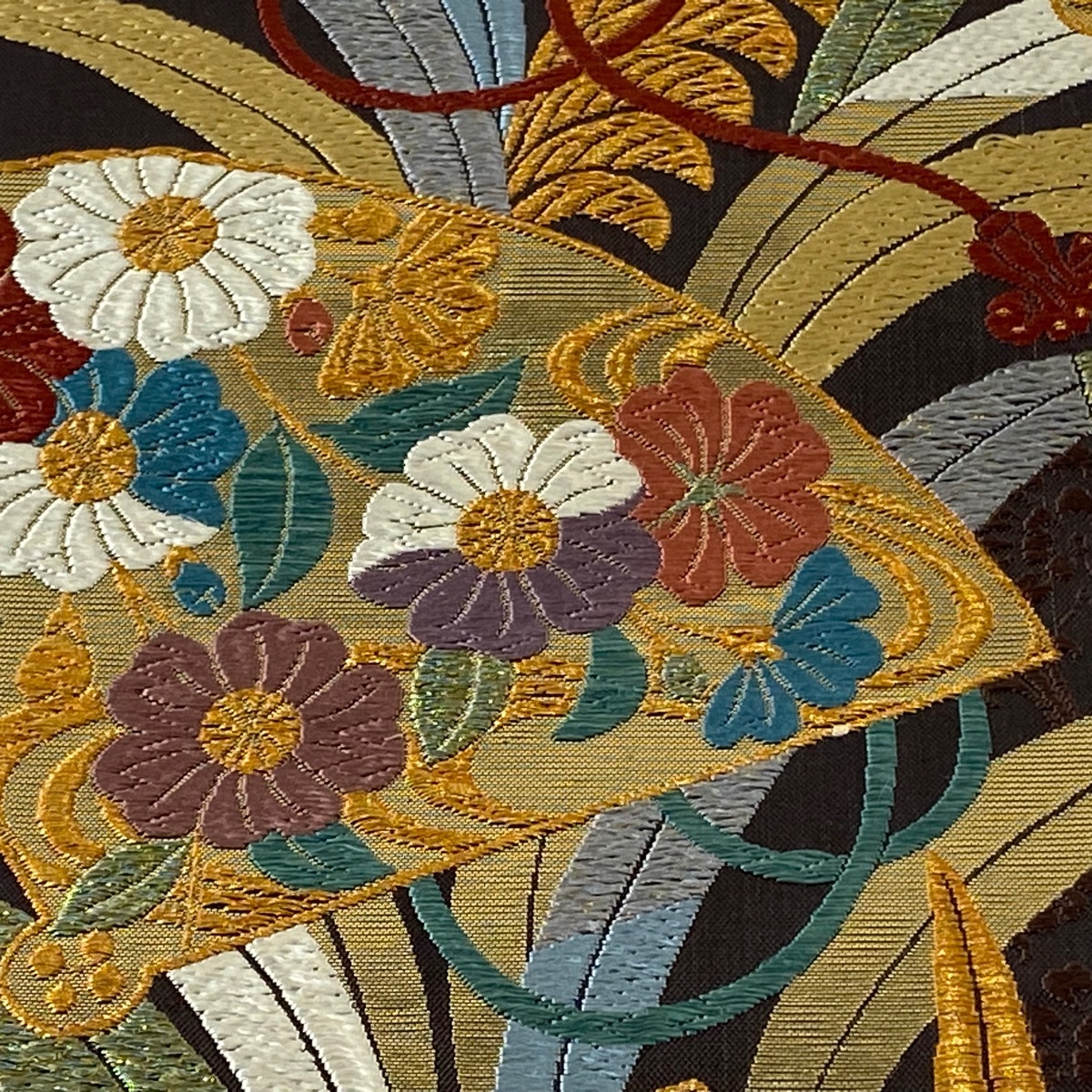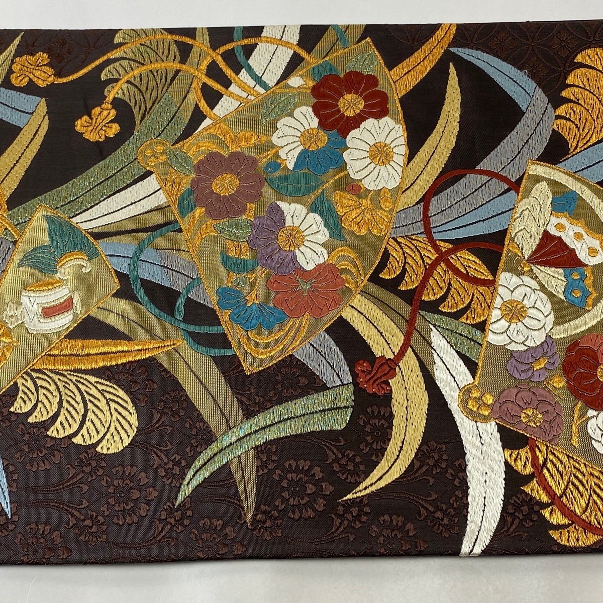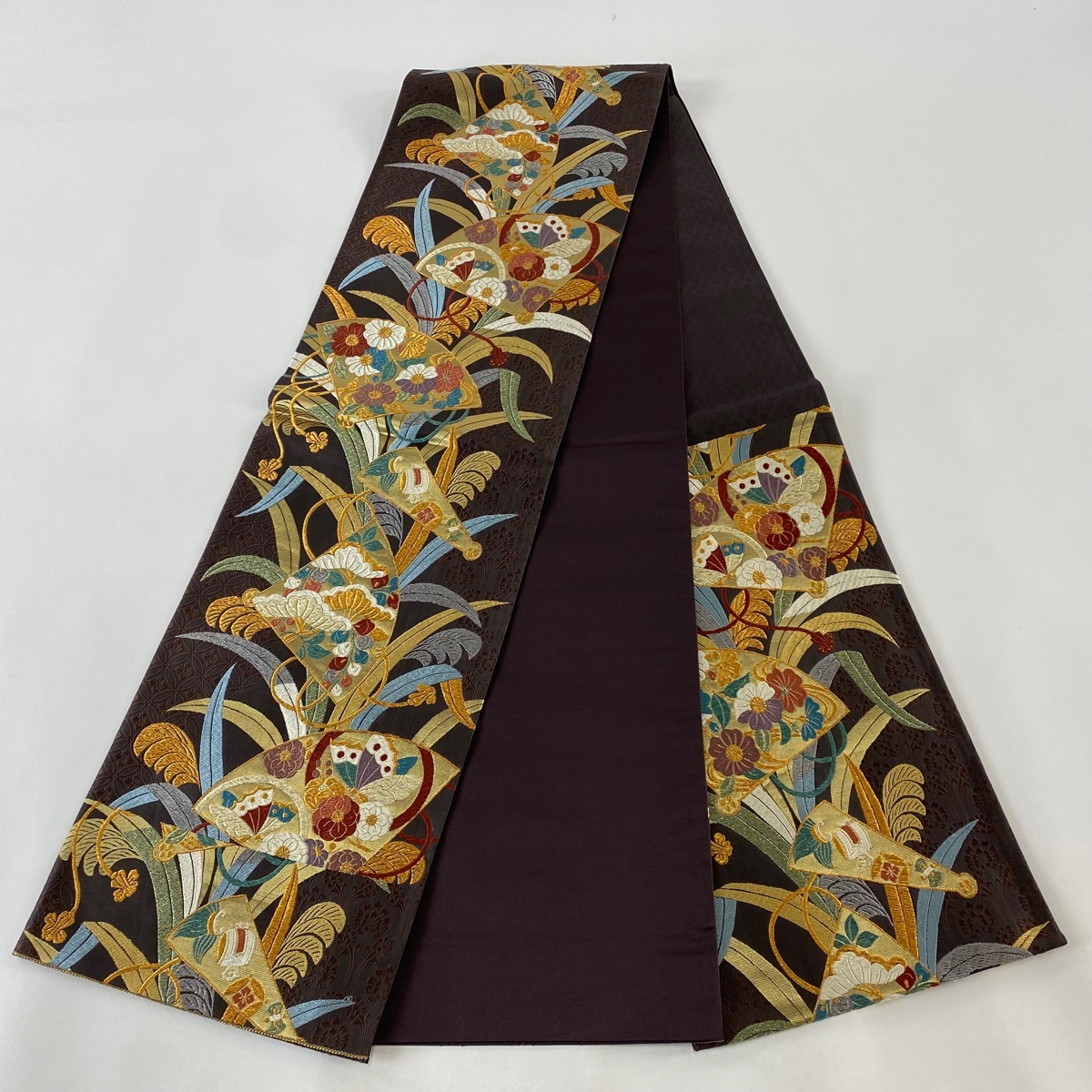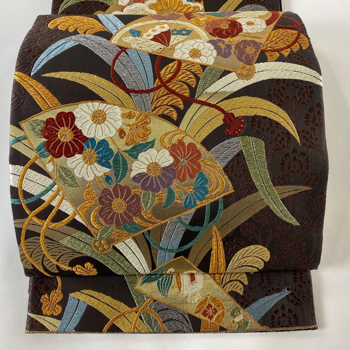 | 袋帯 秀品 扇 草花 金糸 箔 焦茶色 六通 正絹 【中古】 |