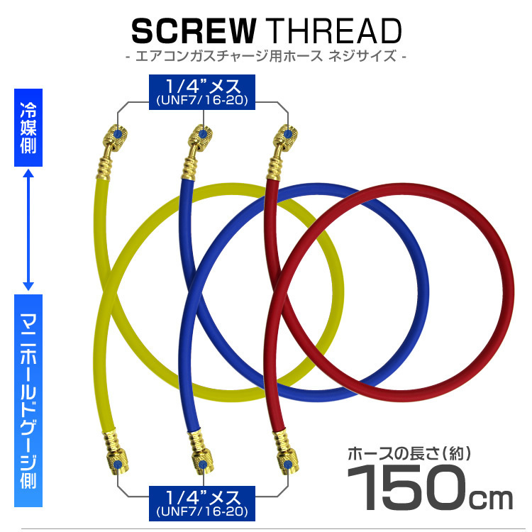 | 商品コード:AT008E ■商品仕様 ホース長さ:150cm 接続口径:1/4フレア(UNF7/16-20) ■商品内容 高圧用ホース(赤ホース) ×1 低圧用ホース(青ホース) ×1 チャージングホース(黄ホース) ×1 ■保証期間 7日間 ※商品到着後7日以内の初期不良・破損のみご対応させていただきます。 ■注意事項 ※ホースや各ポートへの接続は、確実に行ってください。接続不良は、漏れの原因となります。 ※仕様・デザインは改良のため予告なく変更することがあります。 【もちろん新品未使用品です】 ※同仕様のガスチャージホース 長さ90cmはこちら ↓↓↓↓↓↓↓↓↓↓↓↓↓↓ マニホールドゲージ用 ホース90cm 3本セット 商品ページ (商品コード:AT008K) 対応冷媒: R134a R12 R22 R404 R502 |