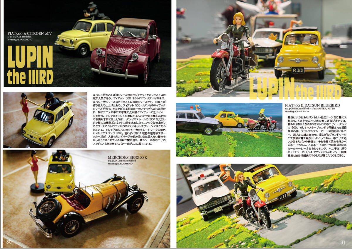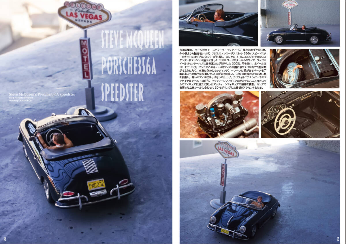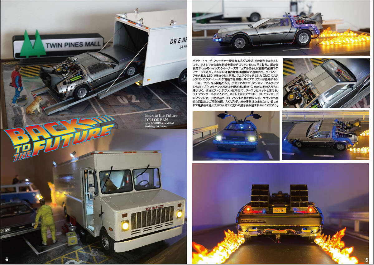 劇中車特集 巻頭はクールの帝王、スティーブマックィーンと愛車の356Aスピードスター、そしてAKIVANAさんによるBTTF新作は、アオシマの新規金型デロリアンとそれを格納するプラ板フルスクラッチ大型GMCステップバン。リビア人のVWT2バスも含めて納得の仕上がり。