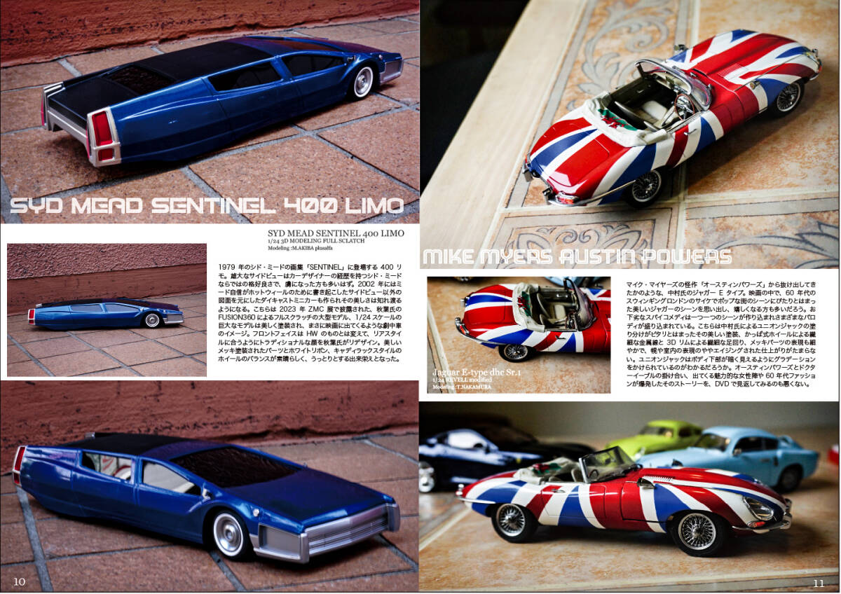 そしてポルトガルFPPモデルのフェラーリ315Sを使った映画FERRARIの中のミッレミリアのシーン、シド・ミード「センチネル」画集より雄大な400LIMO、オースティンパワーズからはユニオンジャック柄のジャガーEタイプを。
