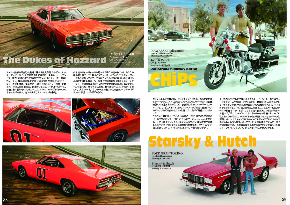 70年代TVシリーズより、MPC1/16ダッジチャージャーの爆発!デューク、1/12アオシマのカワサキポリス1000に合わせてジョン&パンチのフィギュアを3dスクラッチ。レベル1/25フォードグラントリノに合わせるのはスタスキー&ハッチのレジンフィギュア