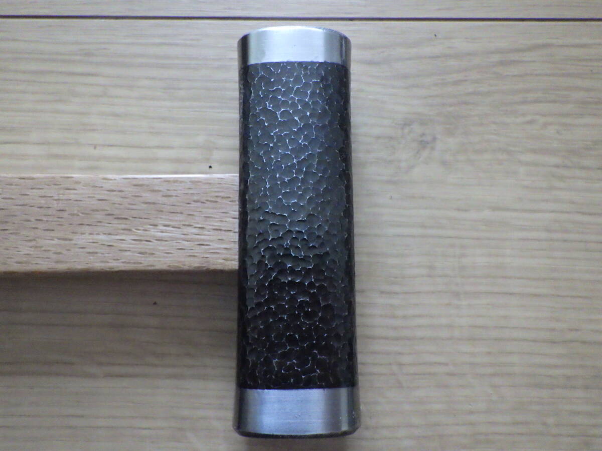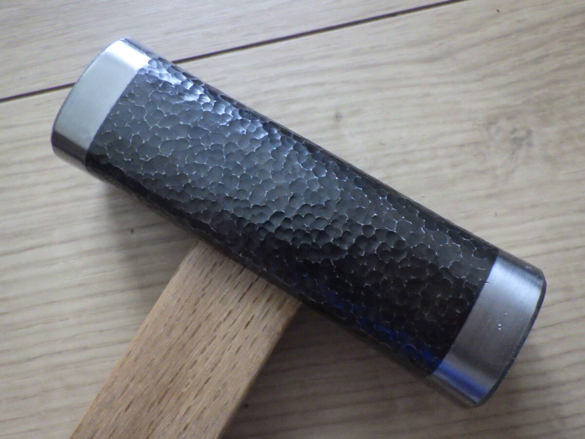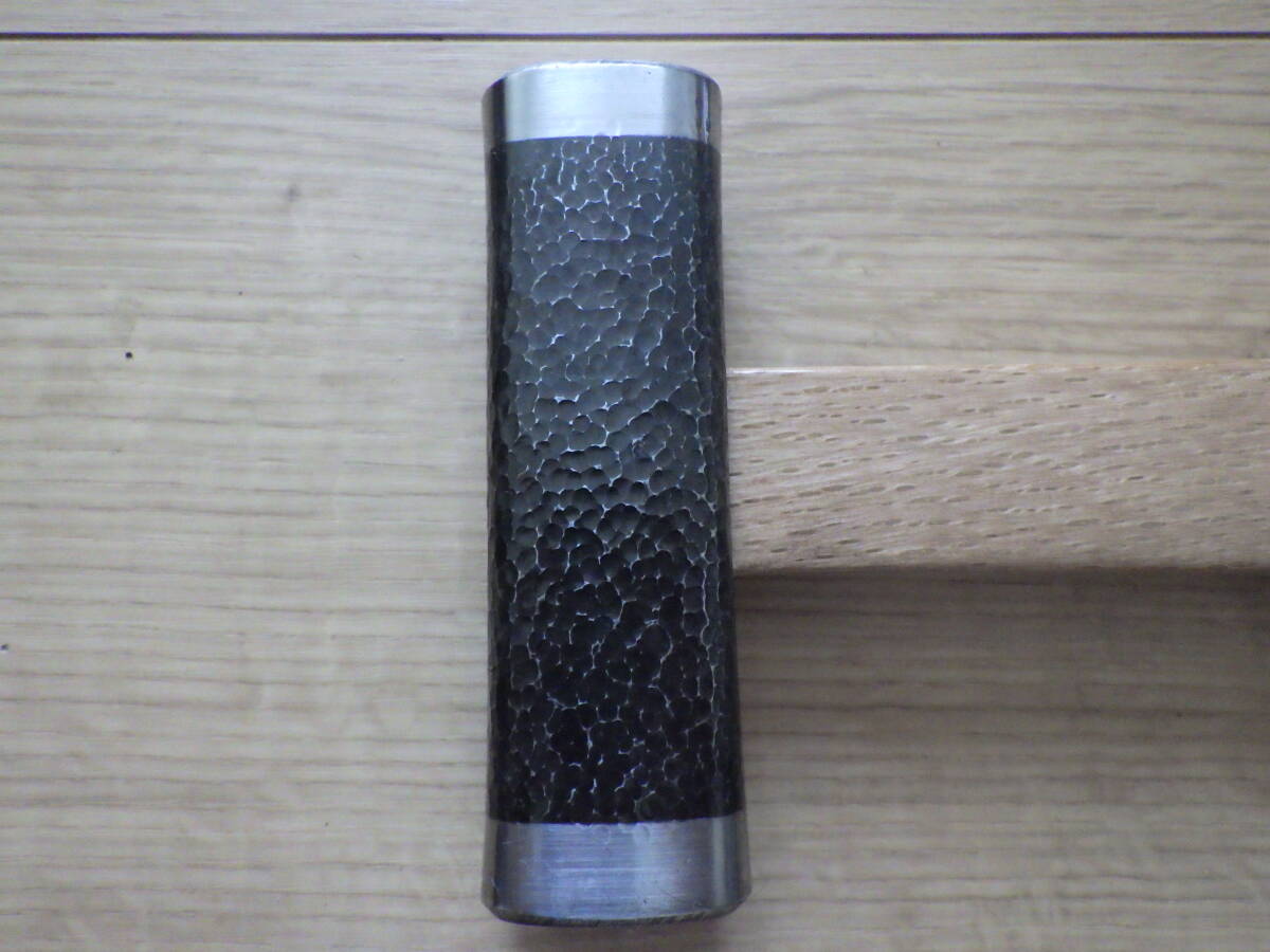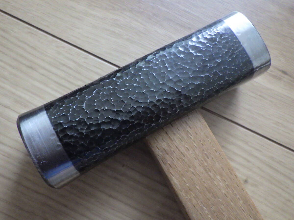 未使用長期保管品の四角玄能(「丸増」銘)に槌目仕上げを施し、新たに白樫柄を挿げたものです。