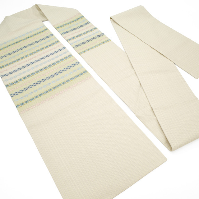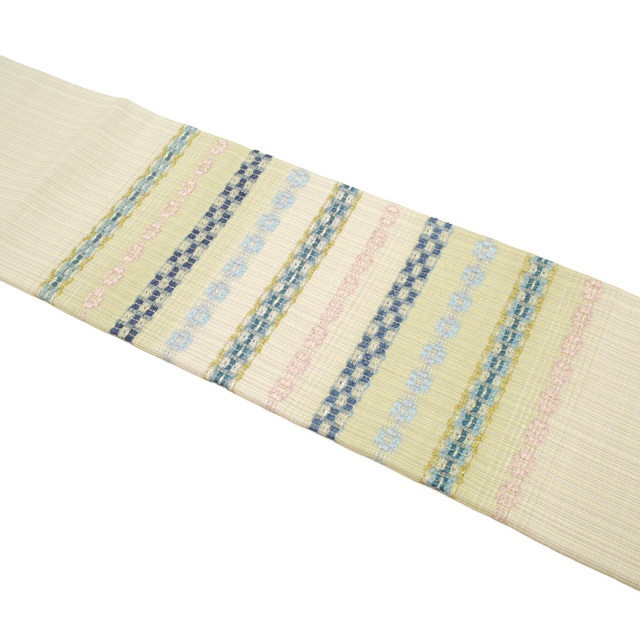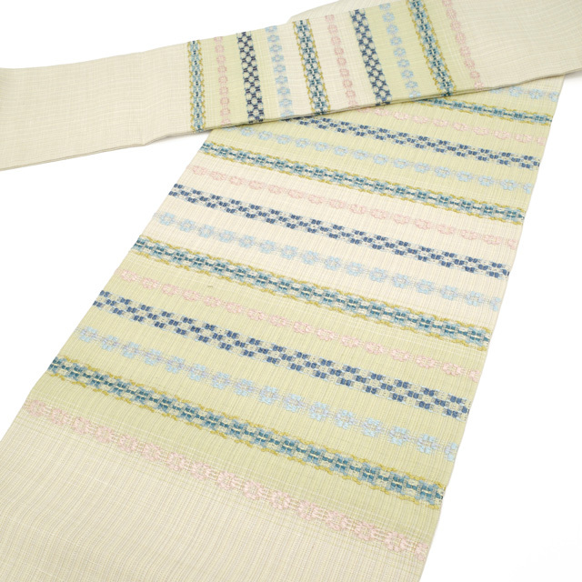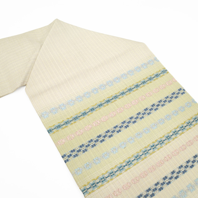 こちらのお品は、淡いベージュとグリーンがやさしいぼかしの横段となって織り出された、上品で柔らかな地色が特徴の名古屋帯です。