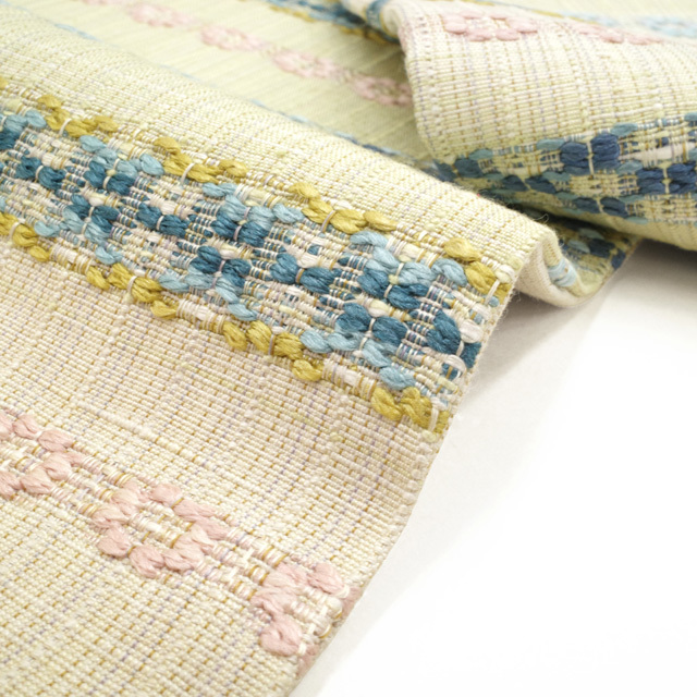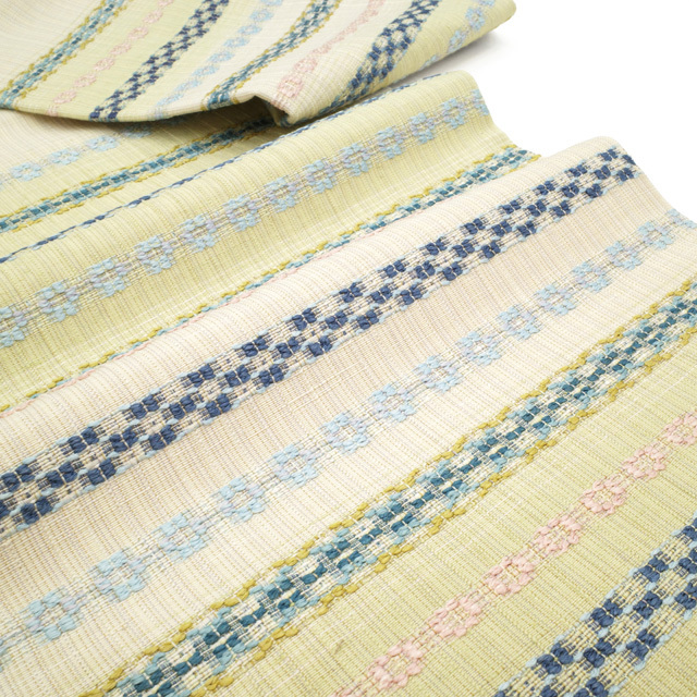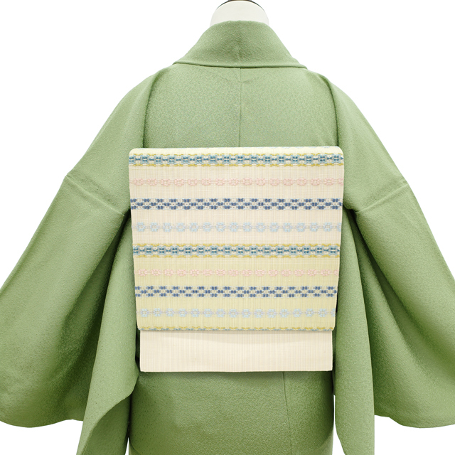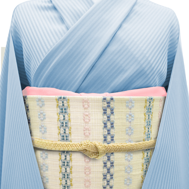 霞のようにふわりと浮かぶように、お太鼓部分には水色・ブルー・ピンクの色糸で織られた花織柄があしらわれており、装いにさりげない彩りと奥行きを添えてくれます。