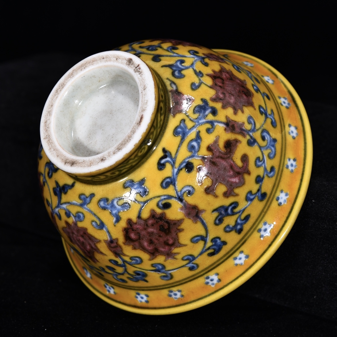 中国磁器 陶芸 磁器『明永楽黄地青花釉里紅花卉紋圧手杯』施釉陶 古代工芸品 陶芸 精美彫 置物 收藏品 | |||