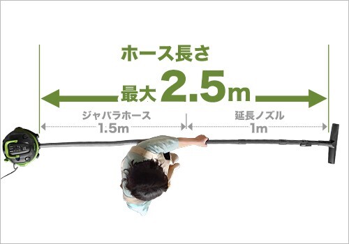 ジャバラホース(1.5m)と延長ノズル(1m)をつけた状態で、最大約2.5mの長さで掃除する事が可能。