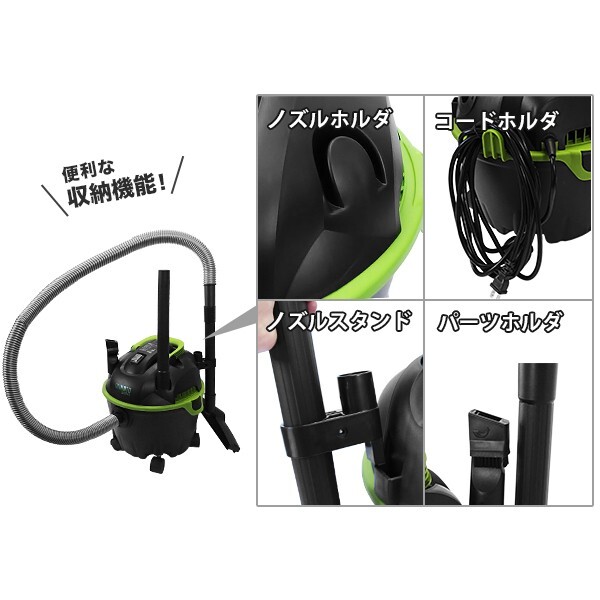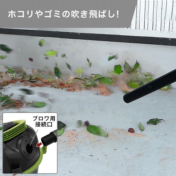 3種類のノズルが付属しており、木くず・砂利・ホコリ等の乾いたゴミや液体の吸引、ガレージ・車内・ビル・倉庫など様々な用途にご使用いただけます。