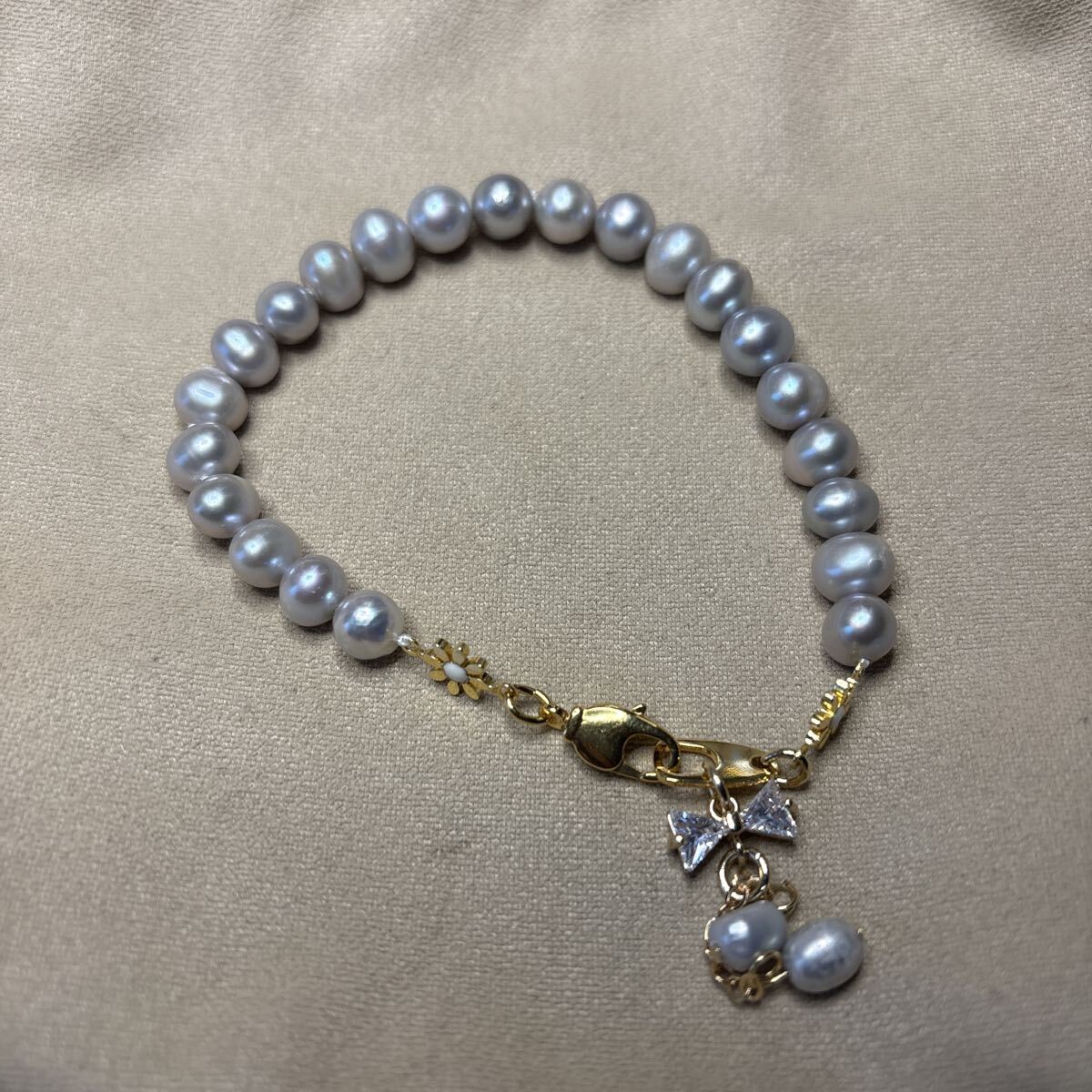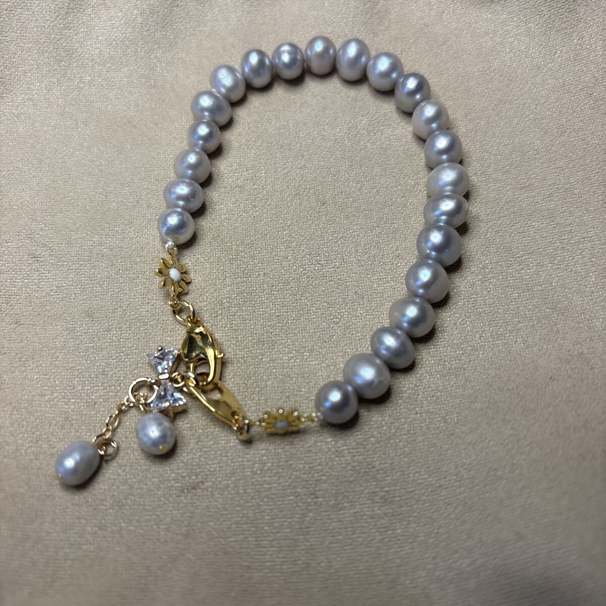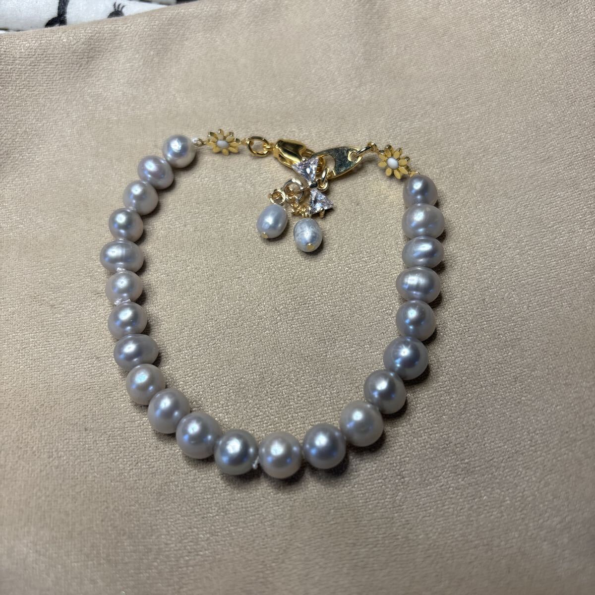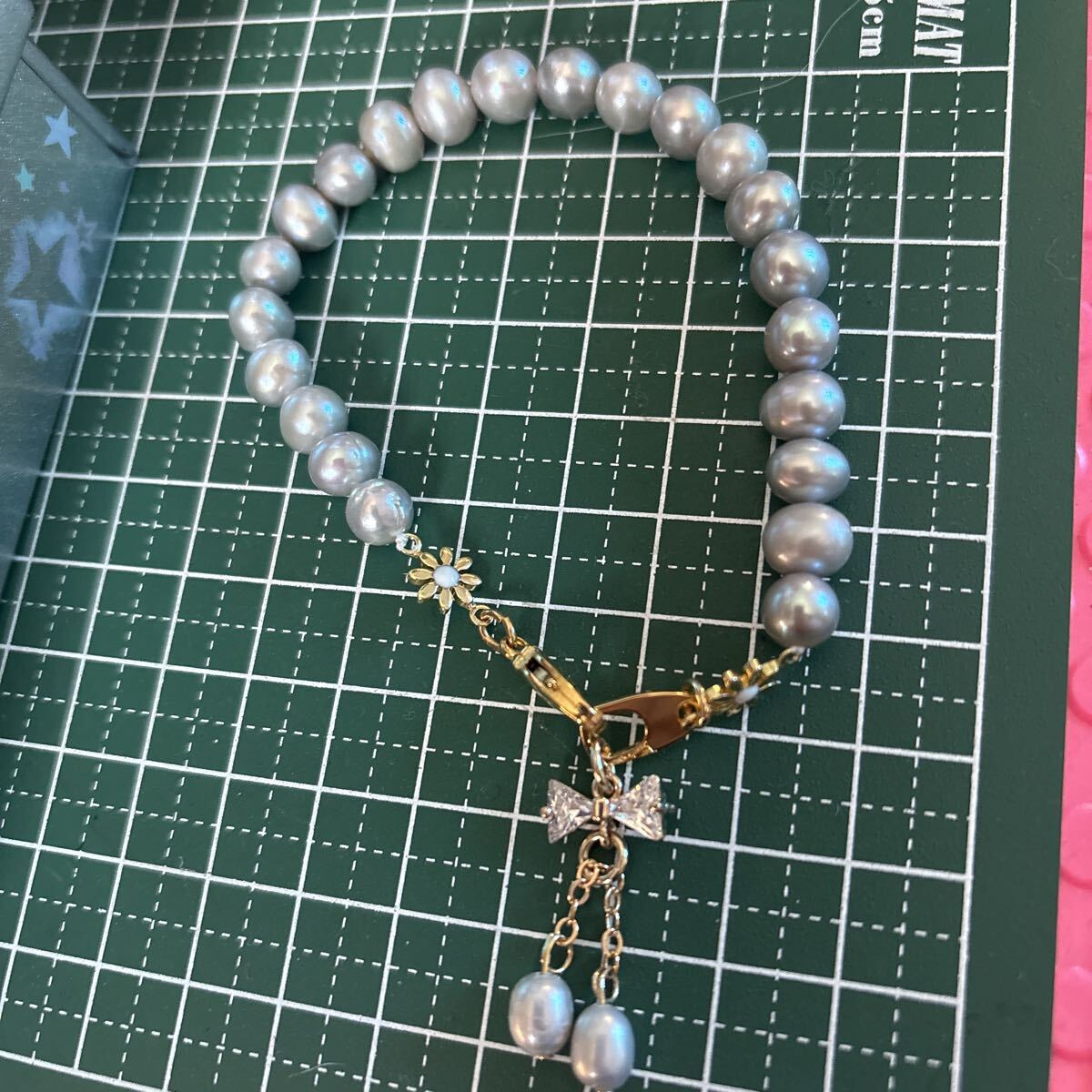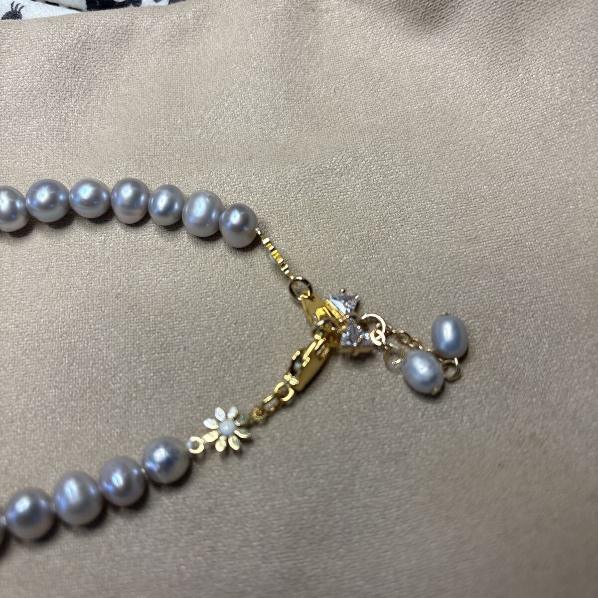 グレーのライス型淡水パールで7ミリくらいあります。天然なので傷凹みあります。グンゼのGPTという大変丈夫な糸で一粒一粒結び目を作って繋いでありますので頑丈です。