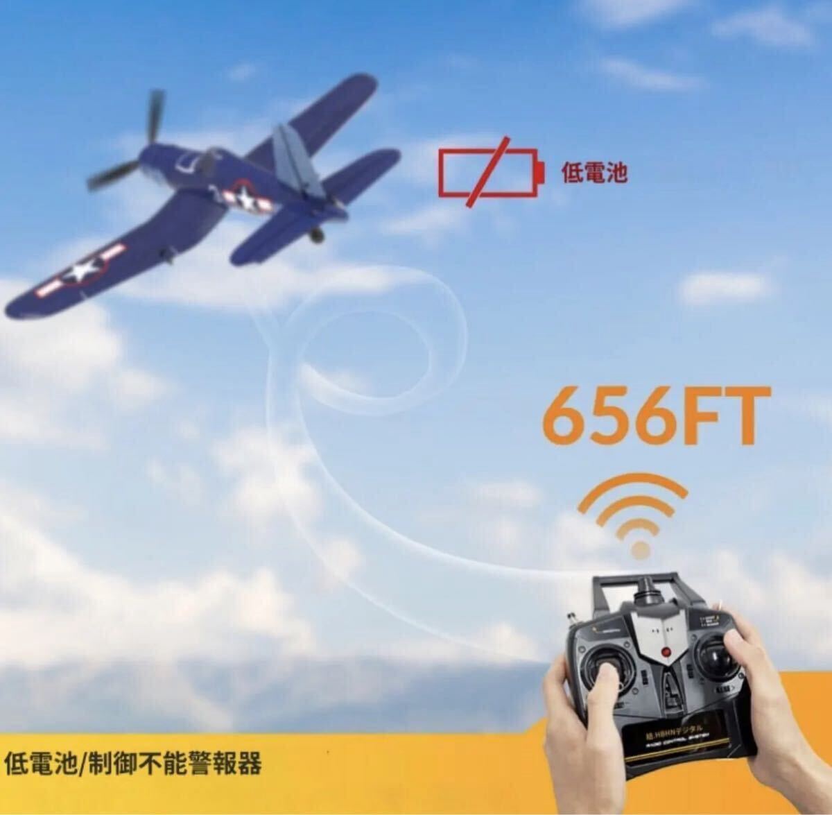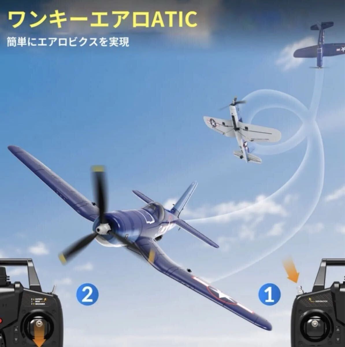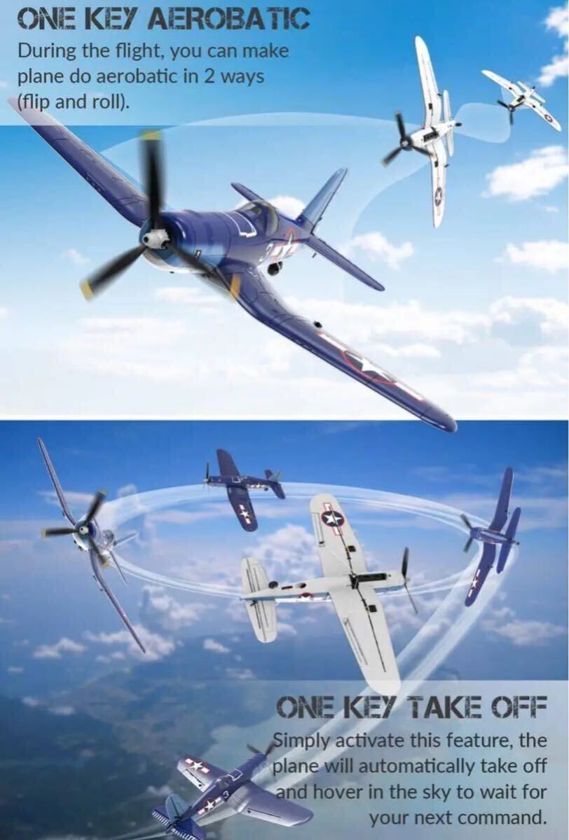 最新V2仕様更新ポイント:①デザインが実機に近く質感が良い塗装②透明なコックポットと人形③予備プロペラは4ブレード式羽2枚附属⑤ 距離超過とバッテリー低下アラーム装備、飛行中バッテリー残量不足と感知し、送信機から警告音が鳴ります、速やかに帰還してください。ロストリスクを減らします。 ⑥ワンボタン離陸、指示に従って設定した後、スロットルを押すだけで、機体は自動的に上昇し、空に飛んだ後、手動操作に切り替えます。
