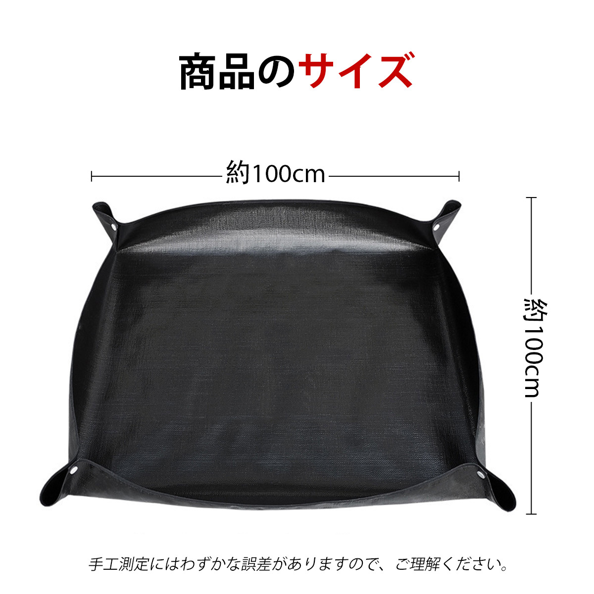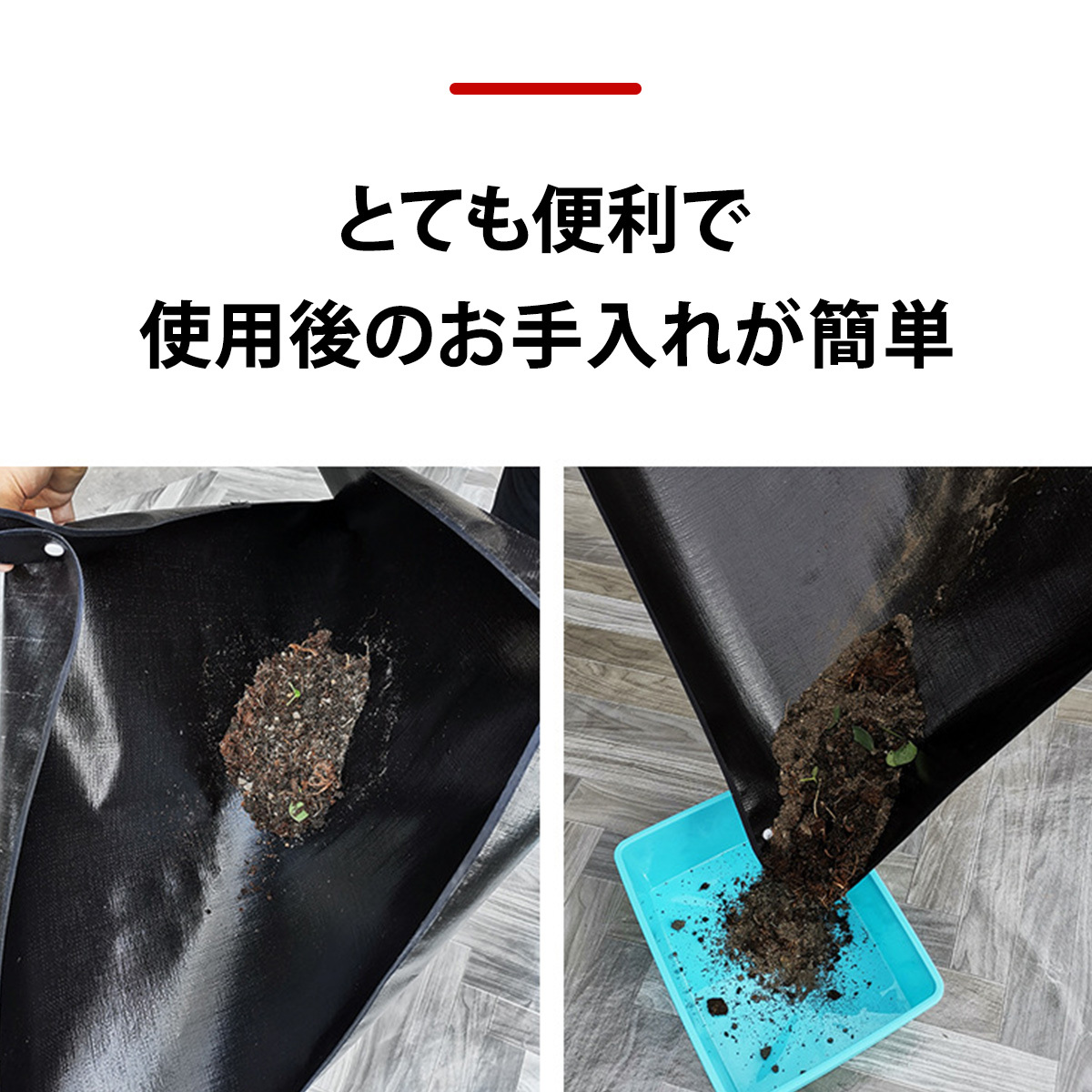 商品の説明 | 【泥汚れをシャットアウト】:四隅にスナップボタン付きで、シートの縁が立ち上がるから土がこぼれず、床やテーブルを汚しません。室内でも安心して植え替えや土づくりができます。 【広々100cm×100cmサイズで作業快適】:多肉植物の植え替え、鉢替え、土の混合、ガーデン整理など、さまざまな園芸作業にぴったり。大きめサイズだから道具を広げても余裕たっぷり! 【ダブル防水でお手入れ簡単】:両面防水PE素材で、水や汚れもサッとひと拭き。使い終わったら水で流すだけで、またすぐに使えます。 【繰り返し使えて経済的&エコ】:厚手で丈夫なPE素材を使用。破れにくく、長く使えるから使い捨て不要。環境にもお財布にもやさしいアイテムです。 【多機能で園芸作業の強い味方】:植え替え・土ふるい・剪定・種まきなど、さまざまなガーデニングシーンで大活躍。家庭菜園やベランダ園芸にもおすすめ! |