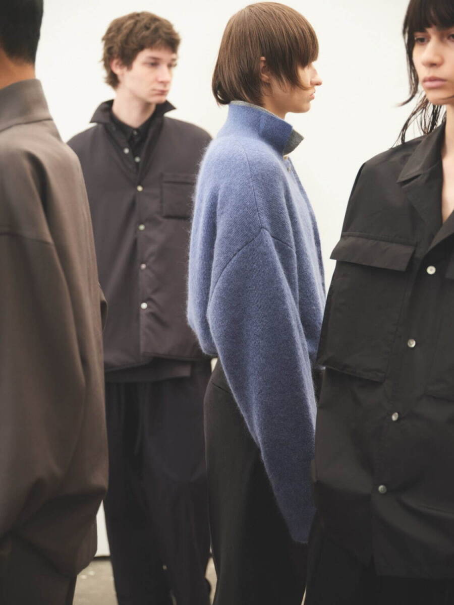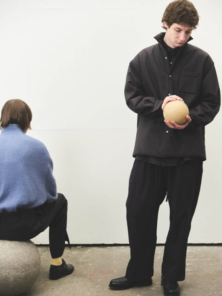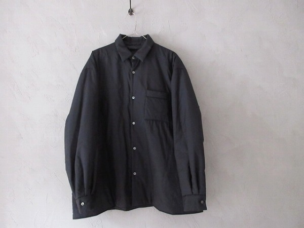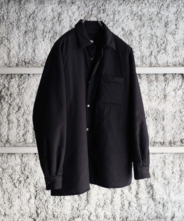 定番ワイドシルエットシャツから生まれた中綿入りシャツも、秋冬らしいアイテムだ。軽量なポリエステルの中綿をあしらい、温かみのある着用感に。シルエットは中綿を入れた分ややコンパクトに作り、ボックスカットの裾でさっと着こなしやすい佇まいに仕上げた。山形・米沢産シルク100%の生地は、程よい光沢とナチュラルなシワ感を兼ね備えているのがポイント。上品ながらも抜け感のある1着となっている。