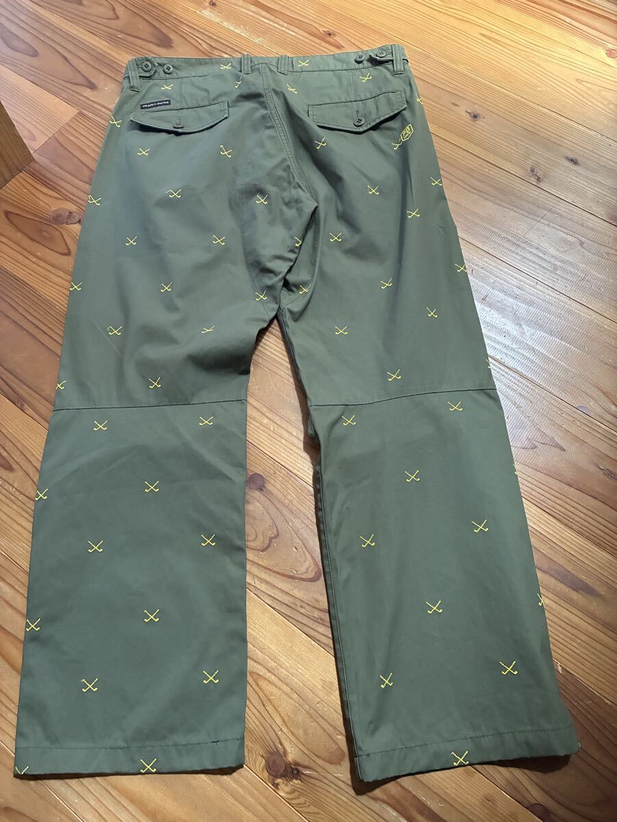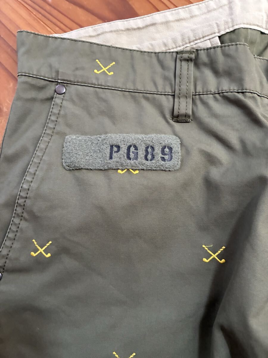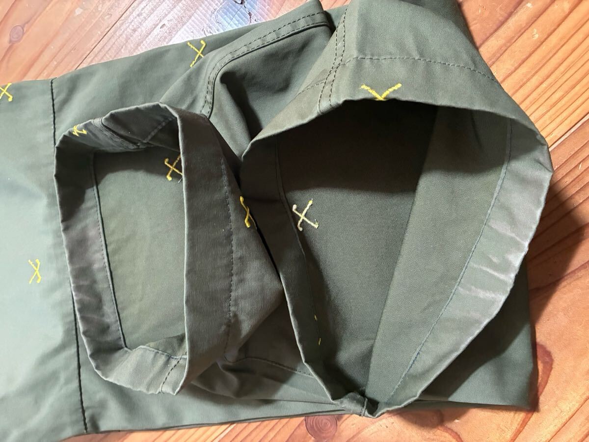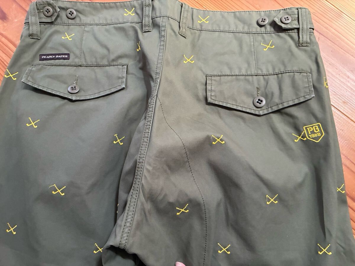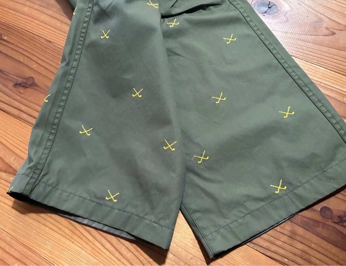 カーキグリーンのパンツにゴルフクラブの総柄の刺繍が入っています。