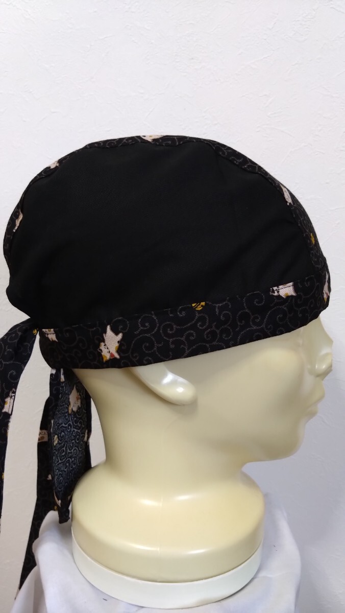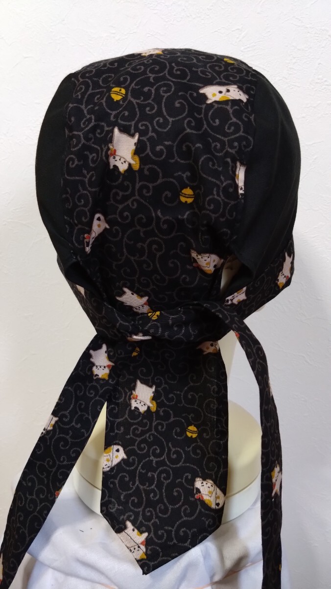 ★バンダナキャップ★ハンドメイド 和柄 唐草×無地 ネコ 黒