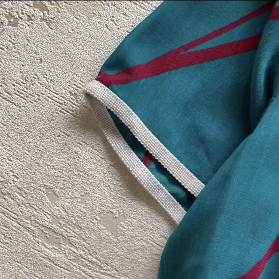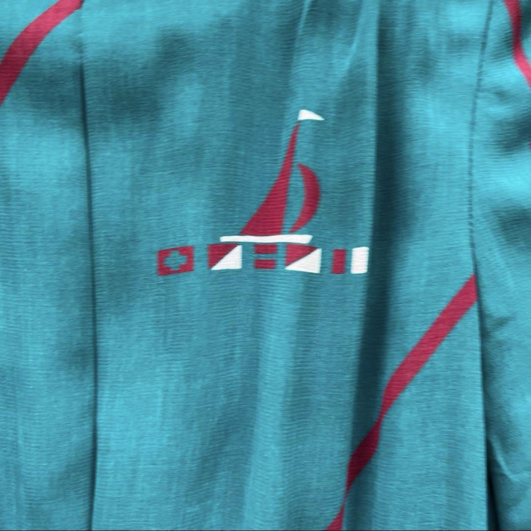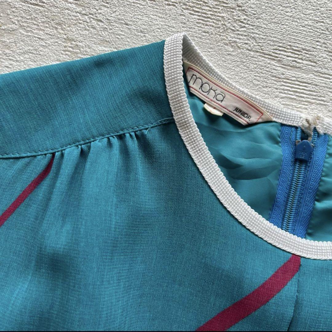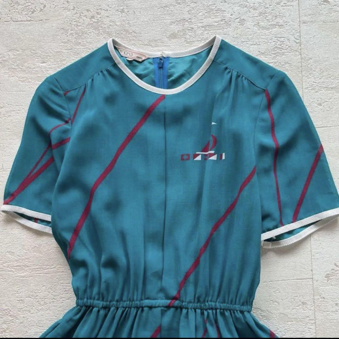 鮮やかなグリーン地に赤と白のラインでヨットモチーフが描かれた、昭和レトロ感漂う半袖ワンピースです。ウエストはゴム仕様で、メリハリのあるシルエットを演出しながら楽に着用いただけます。胸元や裾にさりげなく入ったマリンテイストのデザインが爽やかで、夏のお出かけやリゾートシーンにもぴったり。古着好きな方やヴィンテージファッションを楽しみたい方におすすめの一枚です。デイリーコーデにはもちろん、イベントや撮影用の衣装としても活躍します。