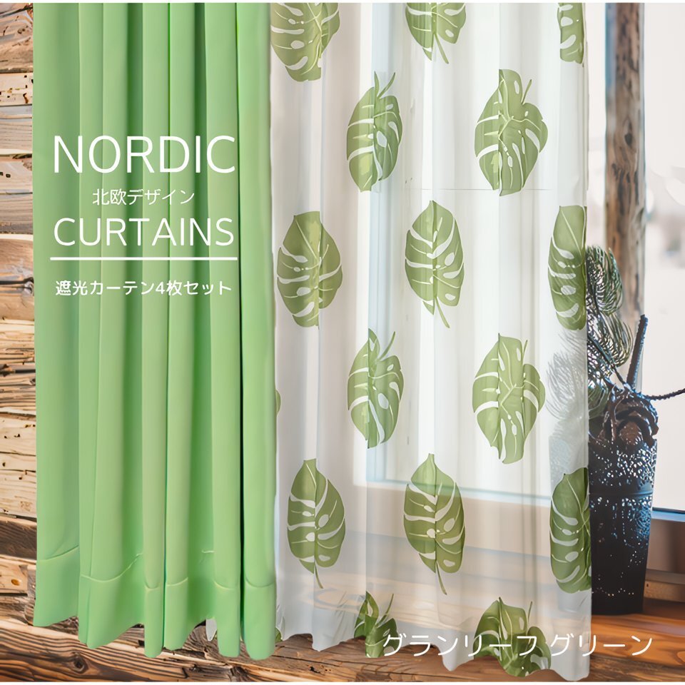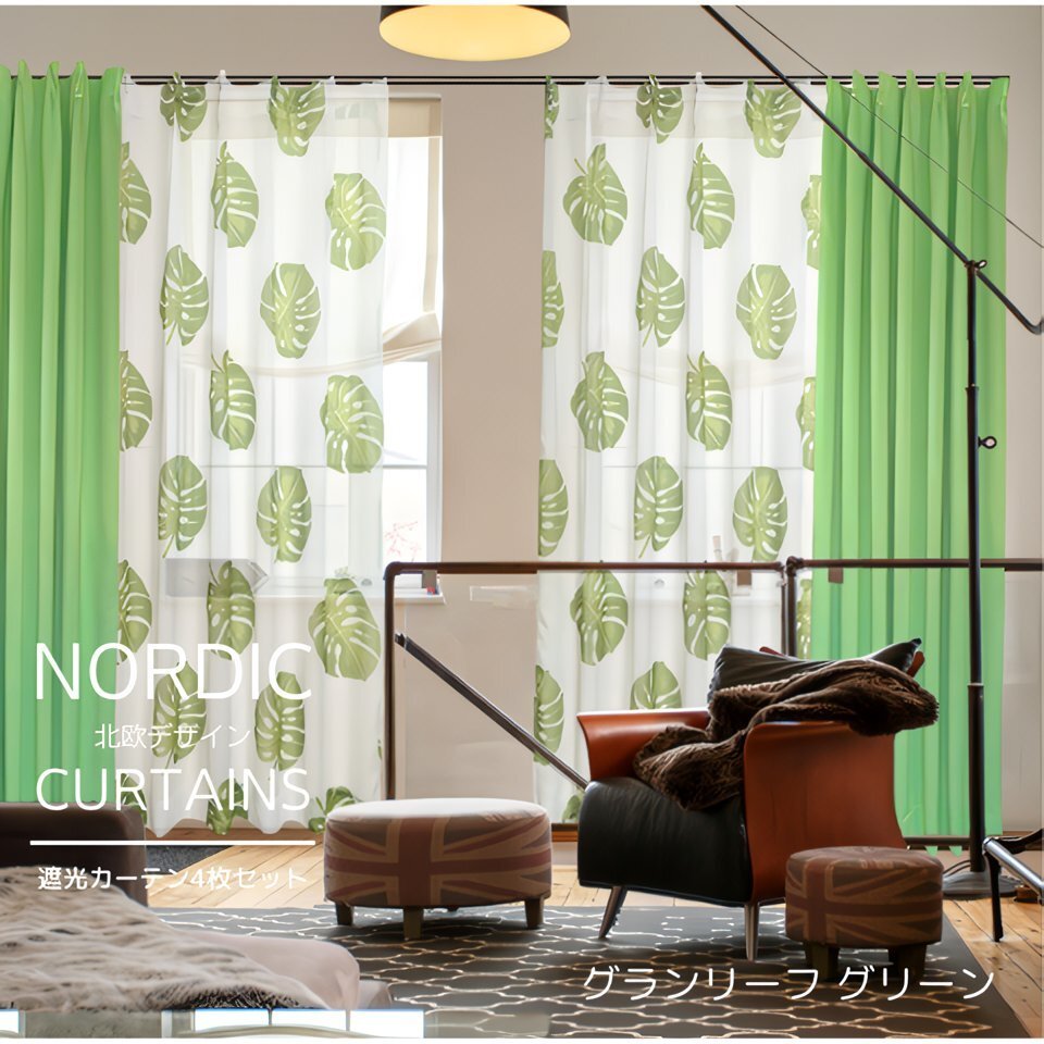 | こちらはグランリーフ/グリーン 丈135cmのページです。 3級遮光厚地2枚+北欧風レース2枚の 合計4枚セットカーテン | ||||