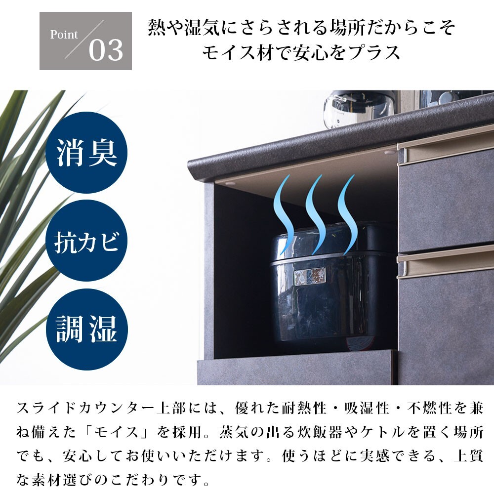 調理家電を効率的に配置できるオープンスペースや、スムーズに開閉する引き出し、モイス素材の採用など、日々の家事を快適にする工夫が凝縮されています。