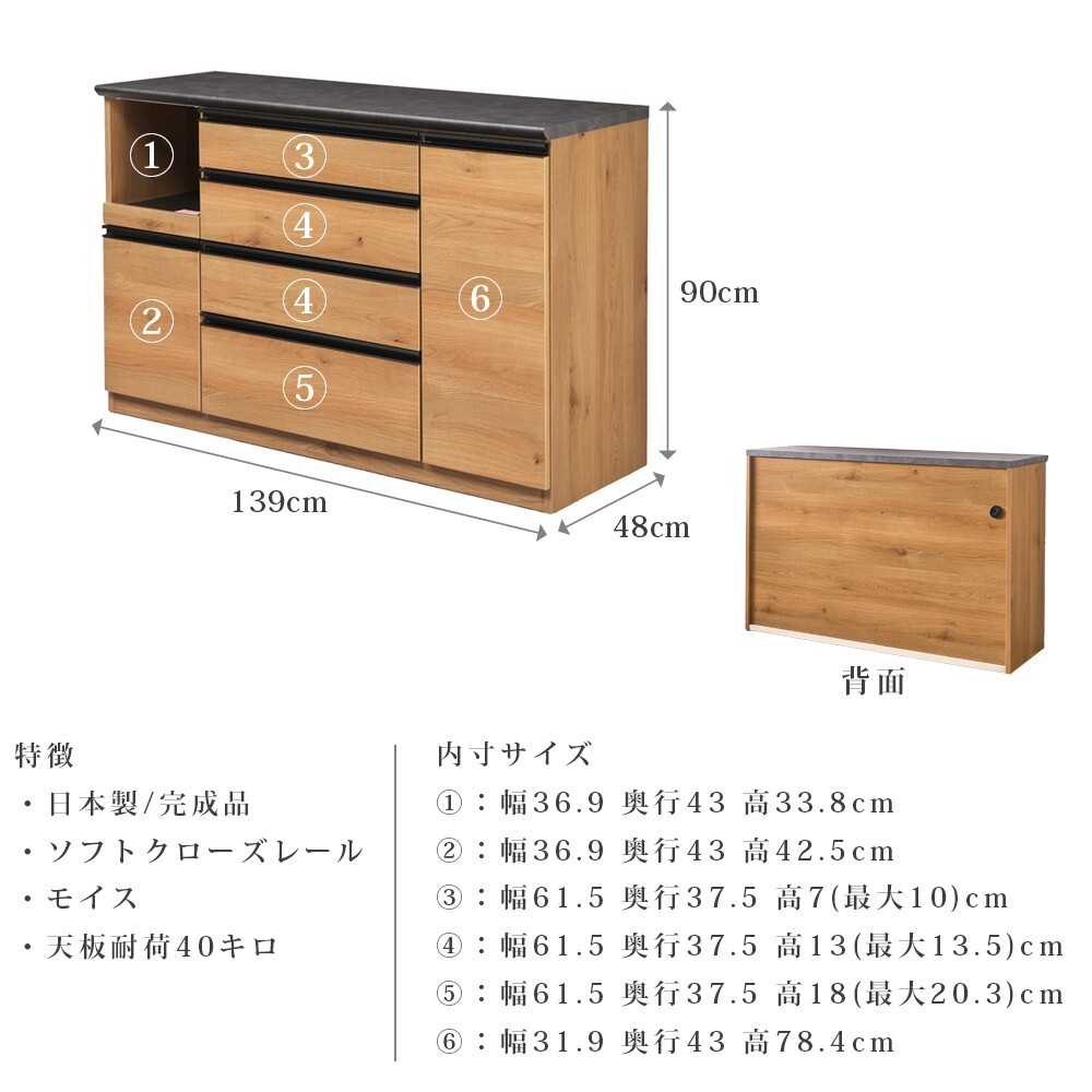 キッチンカウンター 完成品 140cm 間仕切り 引き出し 日本製 大川家具 おしゃれ モイス 奥行き48 ナチュラル