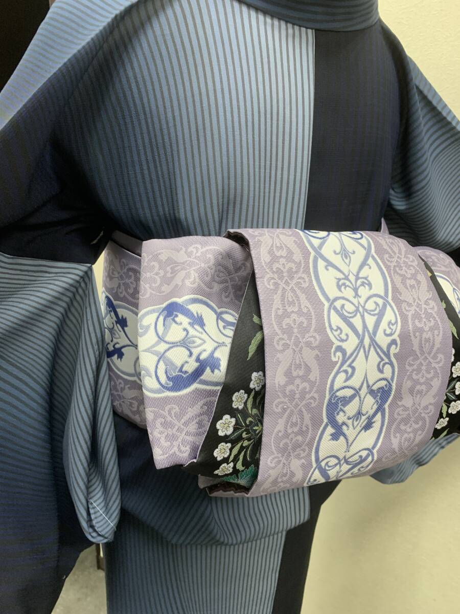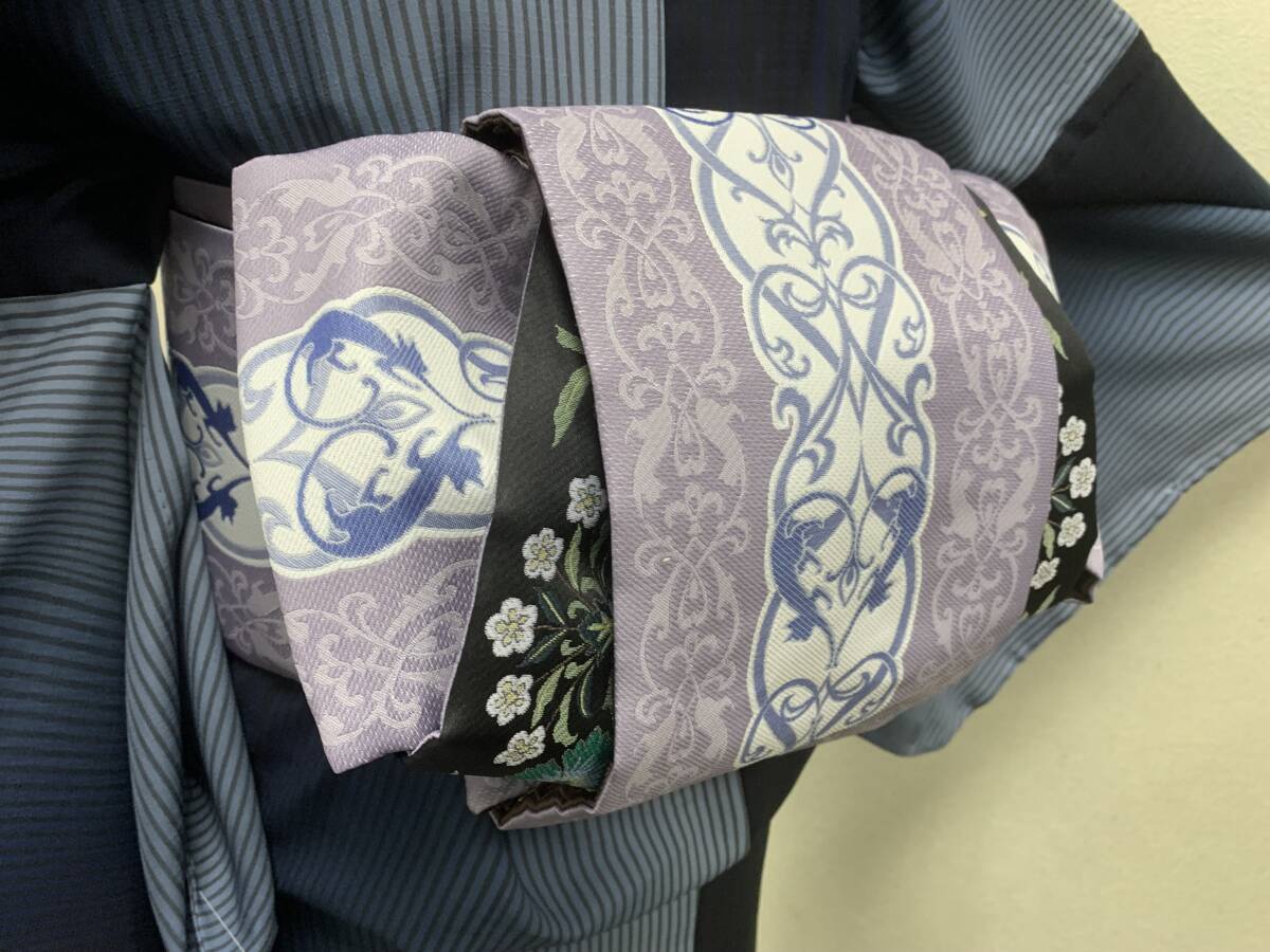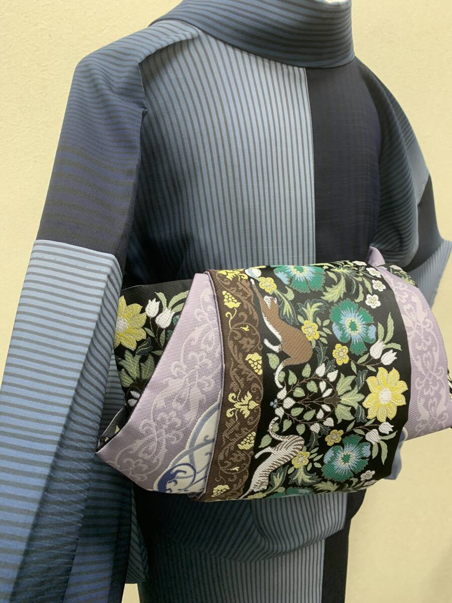 おしゃれな着物に合わせて、両面生かせます。長尺ですので結び方もアレンジできます。