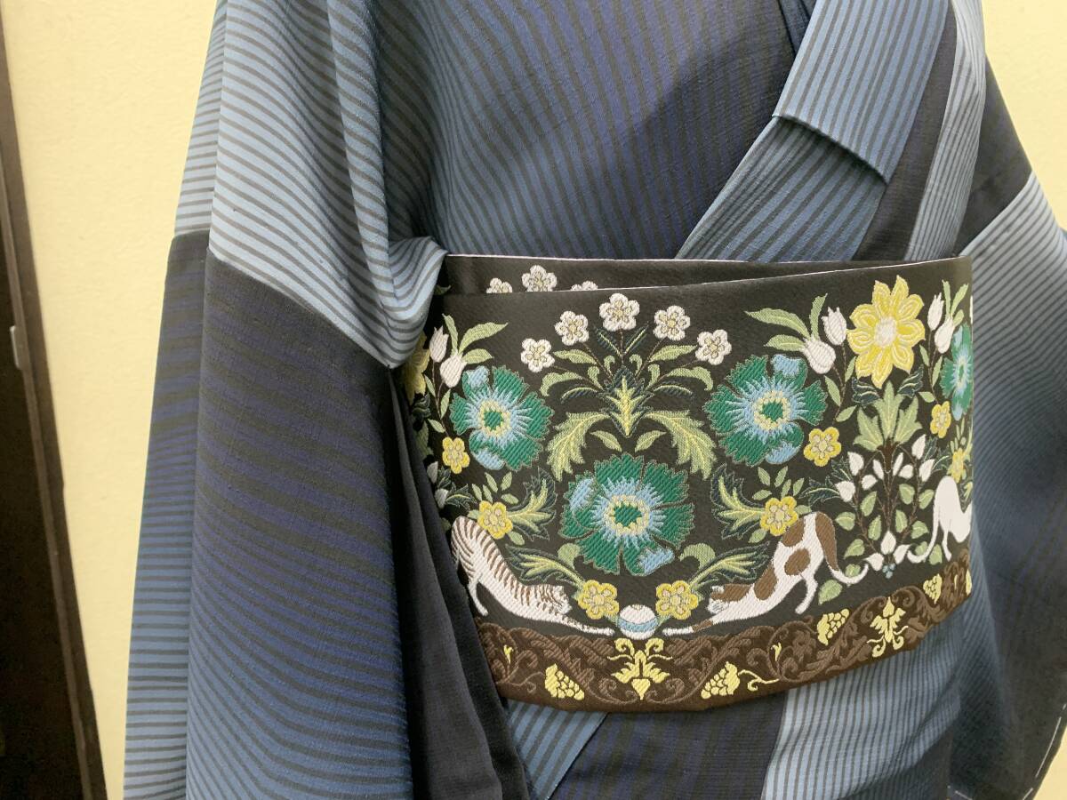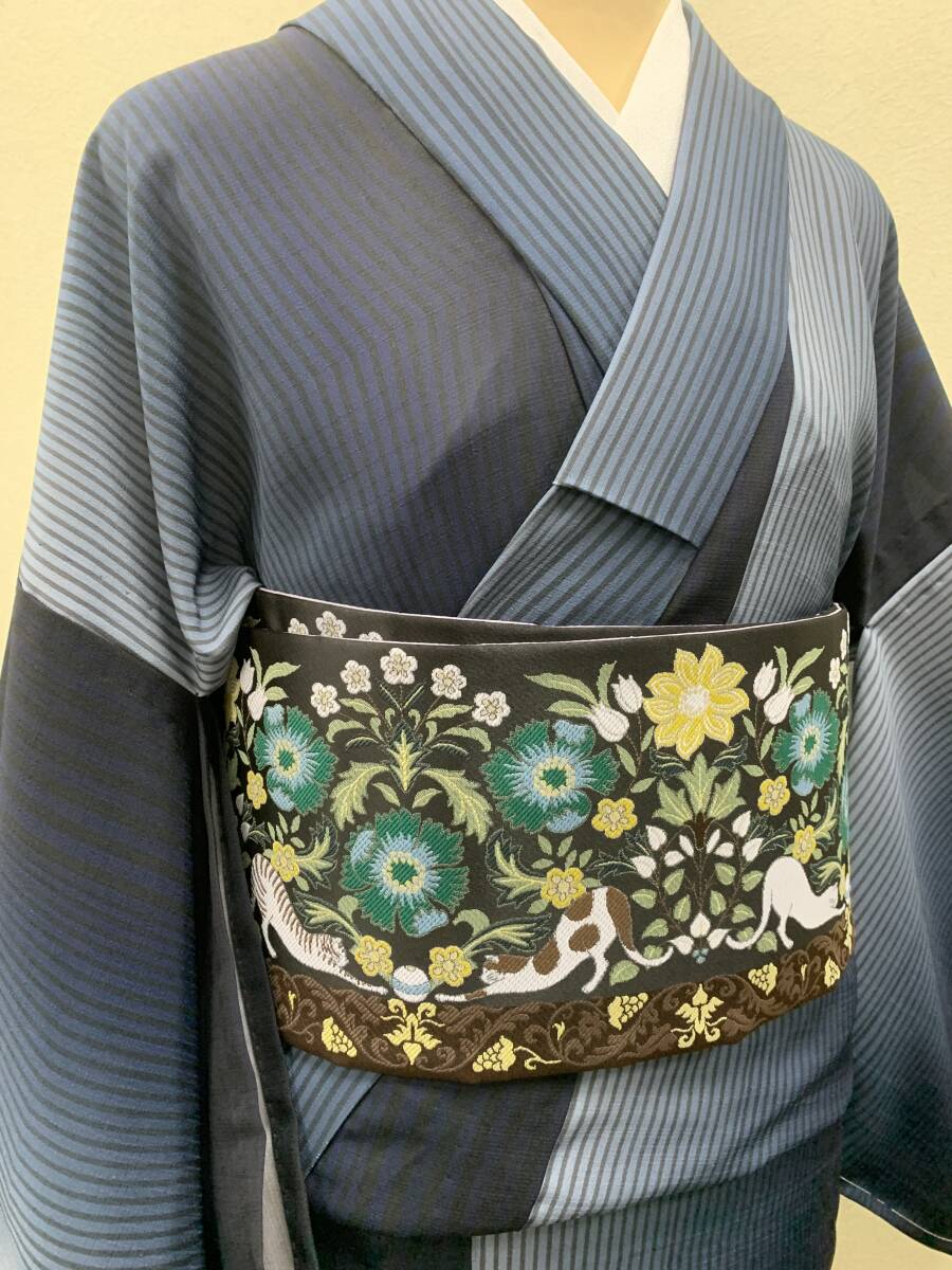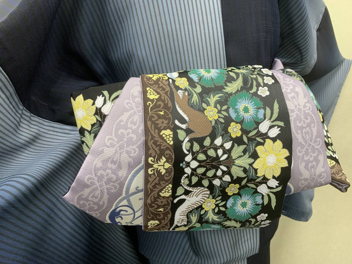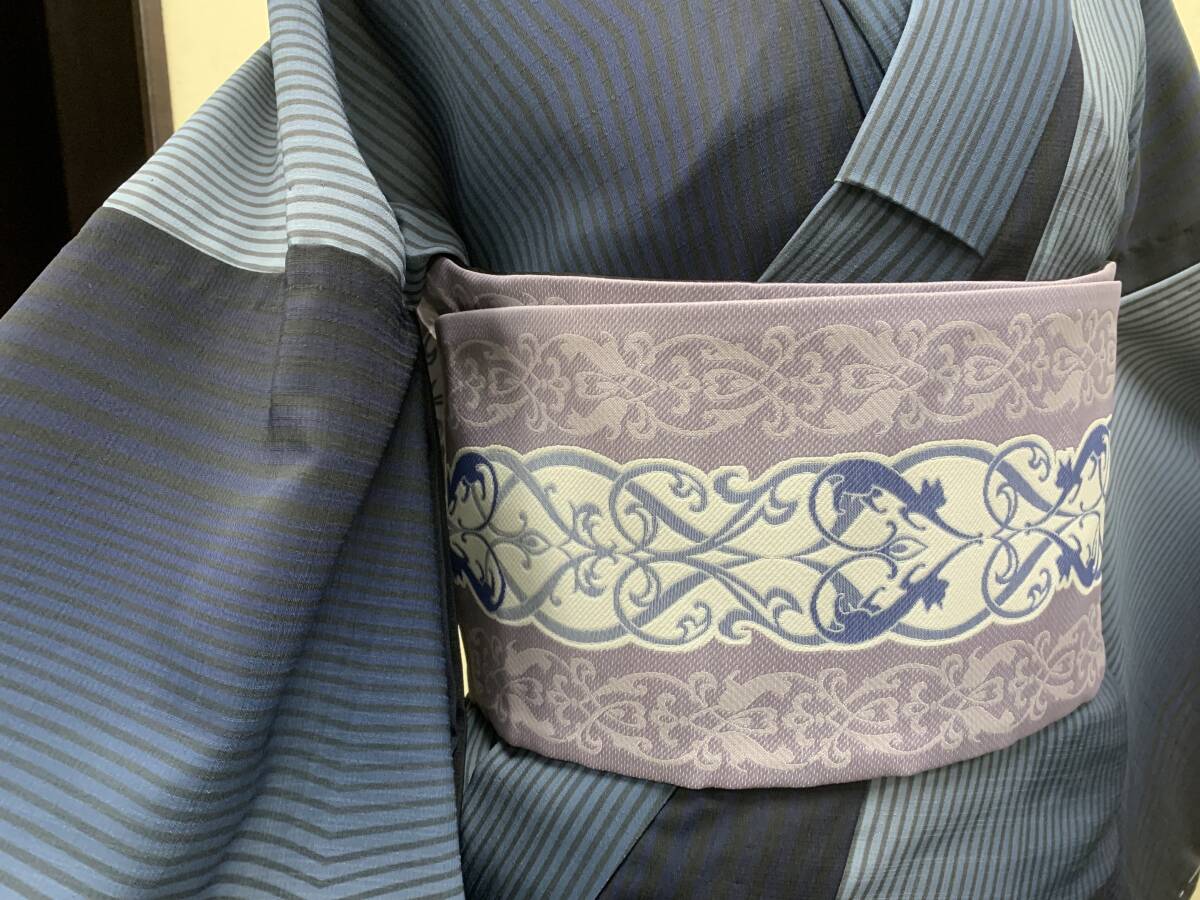 おしゃれな着物に合わせて、両面生かせます。長尺ですので結び方もアレンジできます。
