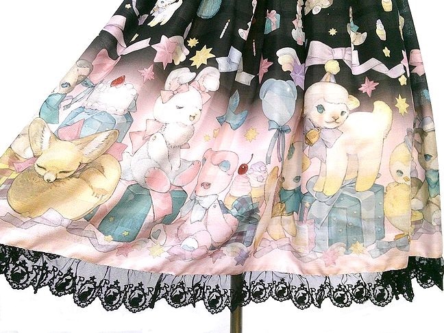 人気イラストレーターねこ助様とのコラボレーションジャンパースカート です! 愛らしいレトロなぬいぐるみたちがお誕生日会を開催! とってもかわいいプリントが目を引きます。ウエスト にはリボンレースのついたピンクリボンがあしらわれています。人気だったお品ですので是非!状態は若干の使用感程度。サイズは・着丈:100m、 ・バスト:約80cm-110cm、 ・ウエスト:約70-110cm、 ※肩紐で5㎝程度調整可能。15206(80)20250822