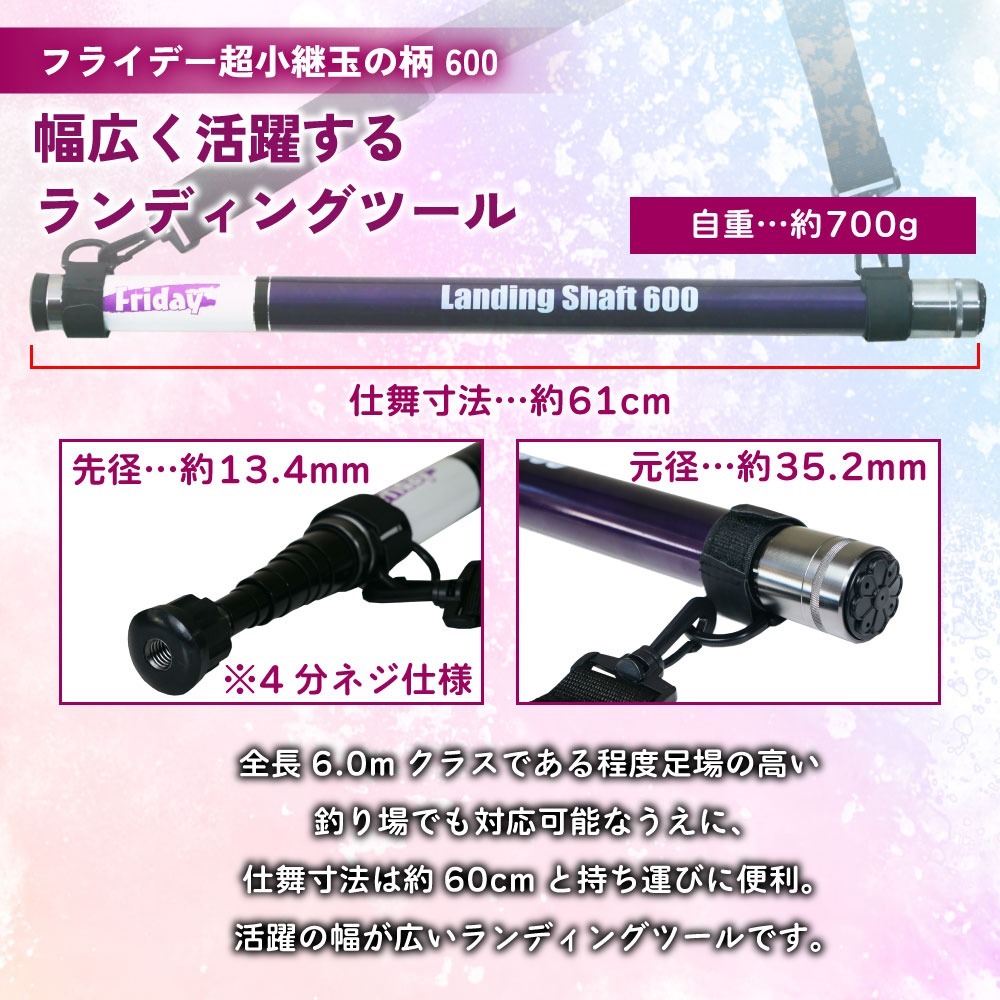 また、全長6.0mクラスである程度足場の高い釣り場でも対応可能なうえに、仕舞寸法は約60cmと持ち運びに便利。活躍の幅が広いランディングツールとなっています。