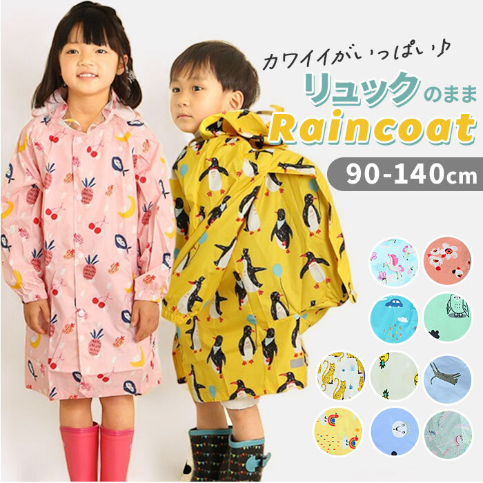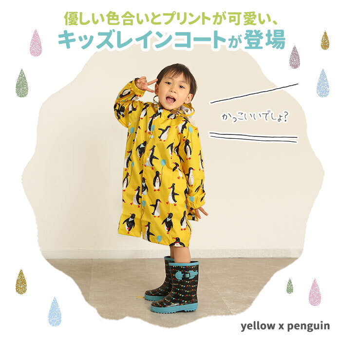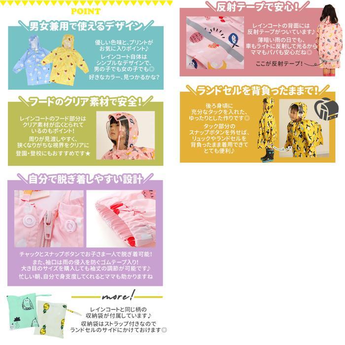 | 商品説明 | ・・雨の日もhappyに!優しい色合いとプリントが可愛い、キッズレインコート♪ ・フードの広い範囲がクリア素材で作られているから、視界をさえぎらない♪ ・背面には反射テープつき。薄暗い雨の日でも、車のライトに反射して光るので安心。 ・後ろ身頃に充分なタックを入れた、ゆったりとした作り。リュックやランドセルを背負ったまま着用できて、とても便利♪ ・袖口は雨の侵入を防ぐゴムテープ入り。多少大き目のサイズを購入しても袖丈の調節が可能♪ ・お子様でも脱ぎ着がしやすい、スナップボタン。 ・お気に入りのカラーを選んで、雨の日も楽しくお出かけ♪ |
