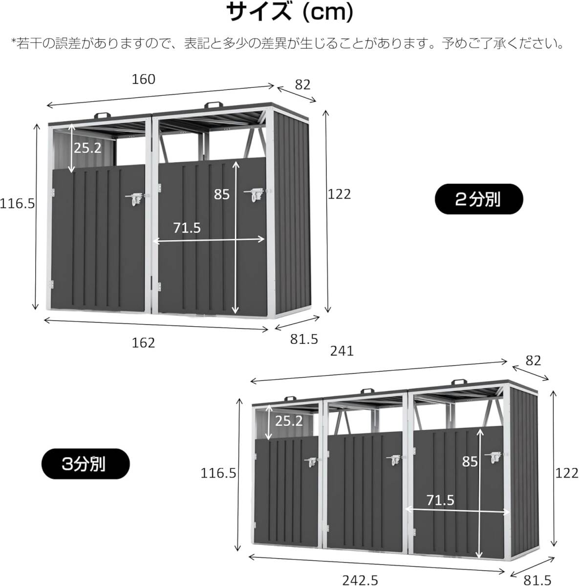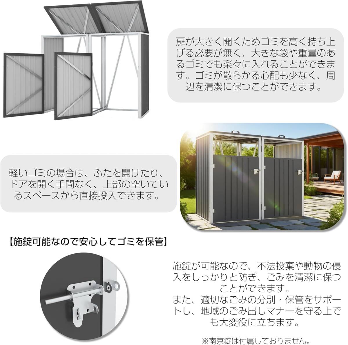 • 【施錠可能なので安心してゴミを保管】施錠が可能なので、不法投棄や動物の侵入をしっかりと防ぎ、ごみを清潔に保つことができます。※南京錠は付属しておりません。また、適切なごみの分別・保管をサポートし、地域のごみ出しマナーを守る上でも大変役に立ちます。