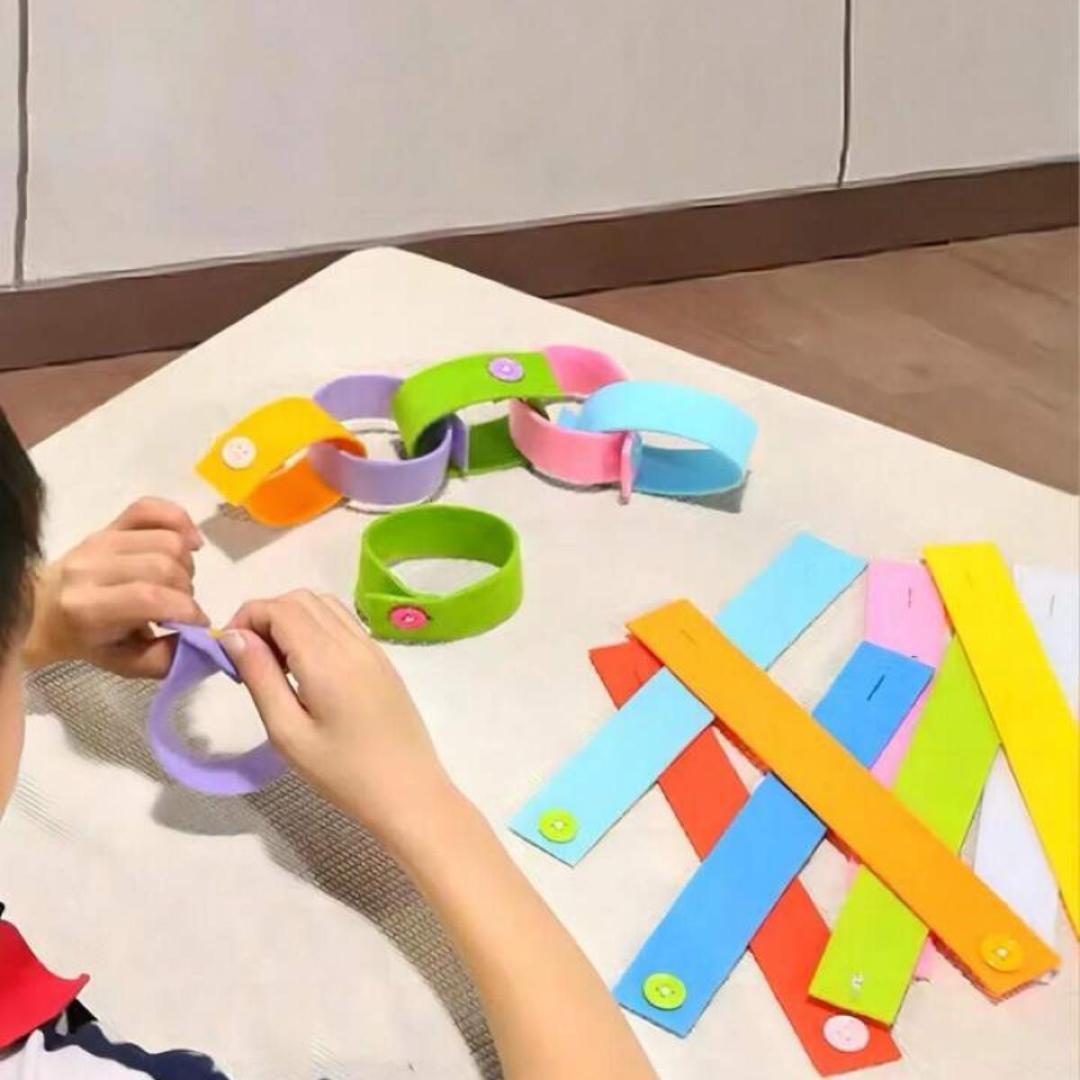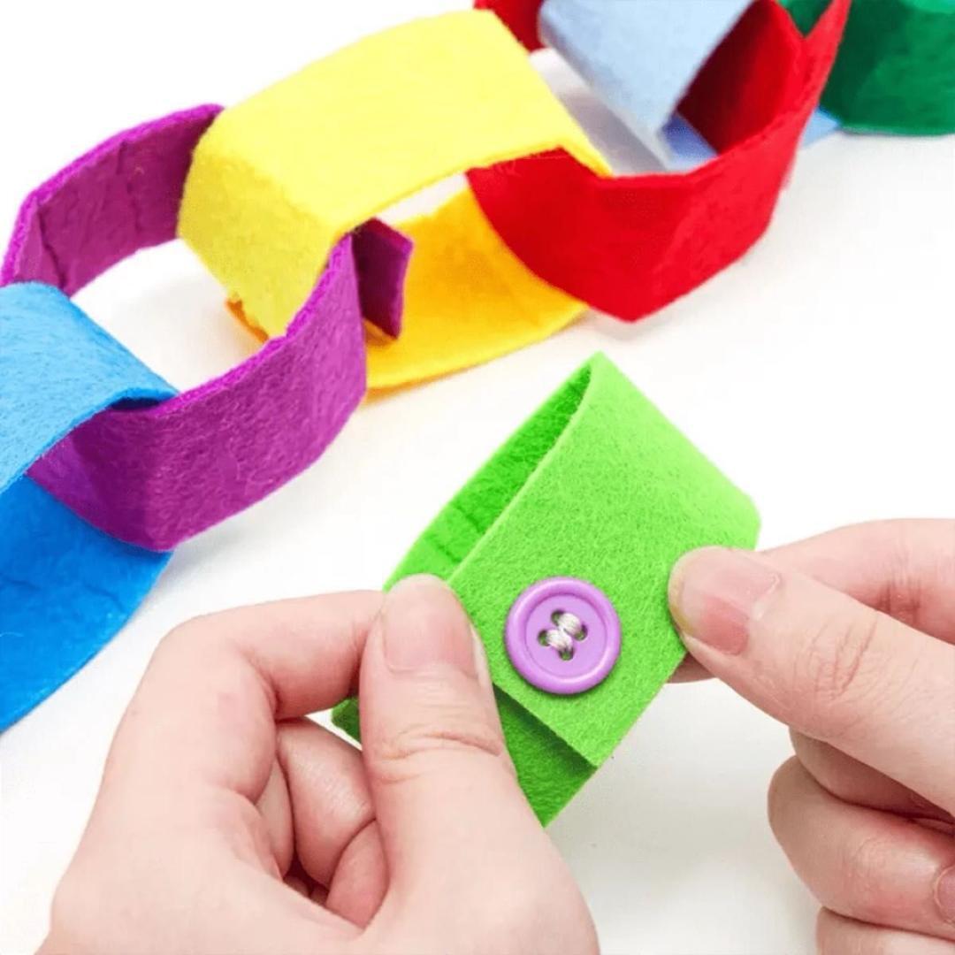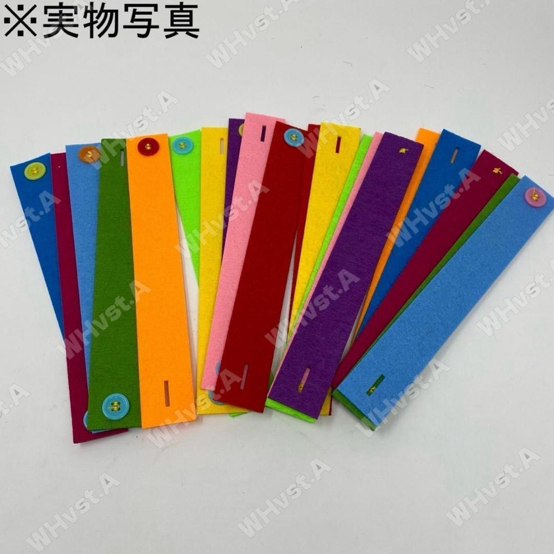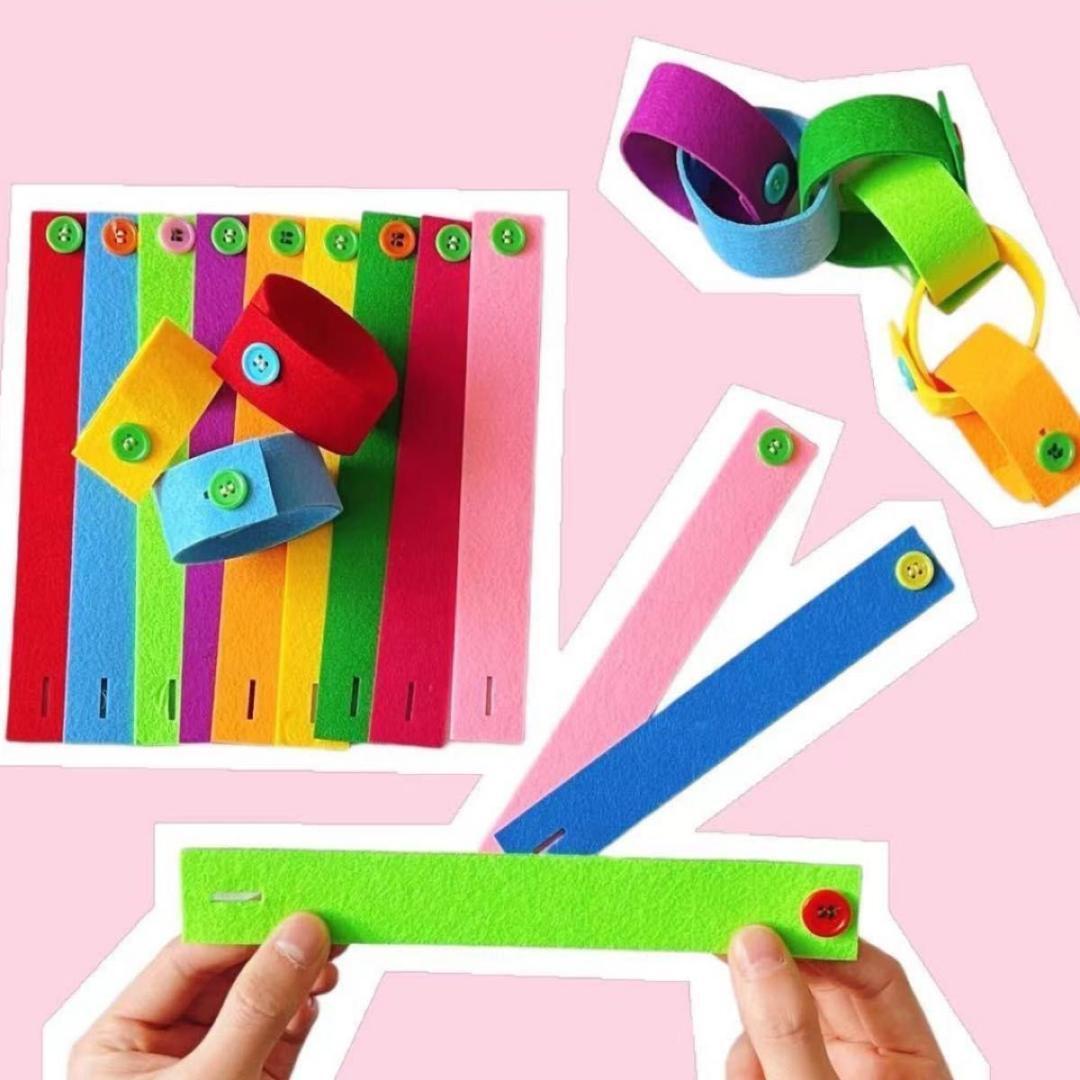 ・フェルト素材は柔らかく、手に馴染みやすい厚みで安全性も高め ・各ストラップに異なる色のボタンを配置し、視覚的な識別力を刺激 ・ボタンのサイズや形状にバリエーションがあり、難易度調整が可能 ・木製トレイは滑り止め加工済みで、安定した作業環境を提供 ・保育現場や家庭での知育遊び、療育支援にも活用されている実績あり