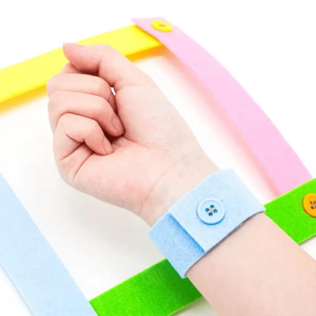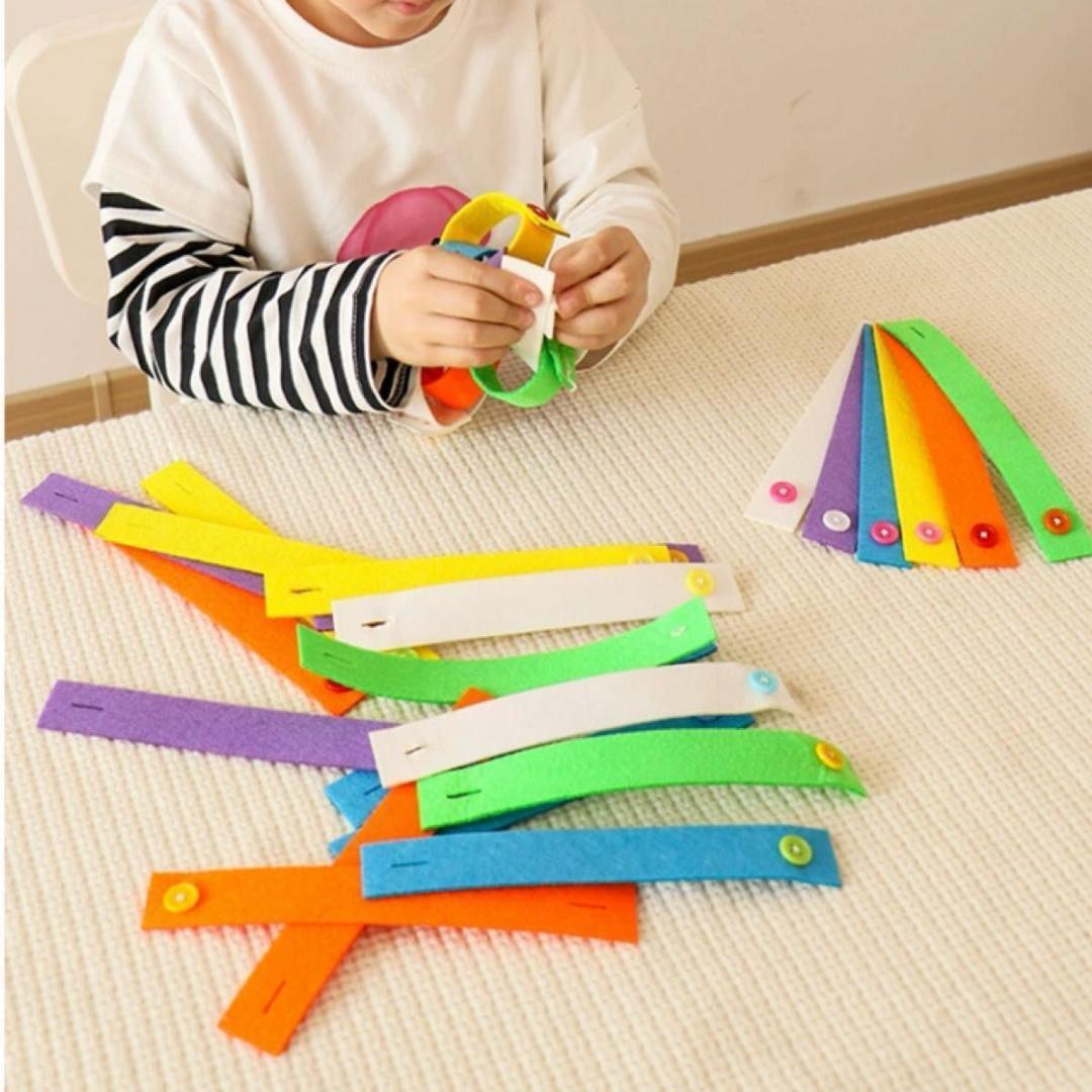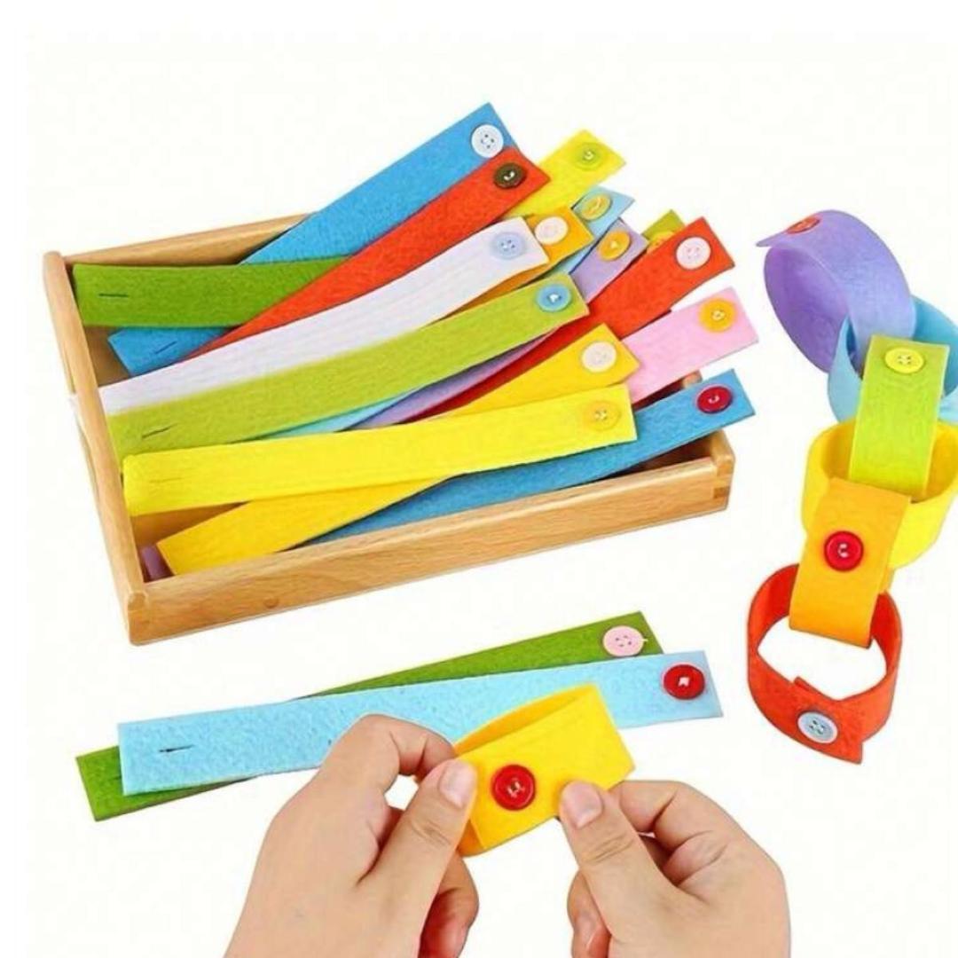 カラフルなフェルトストラップに大小さまざまなボタンを縫い付けた、指先の発達を促す知育アイテムです。木製トレイに整然と並べられたストラップは、色彩感覚と集中力を養いながら、ボタンの留め外しを繰り返し練習できます。