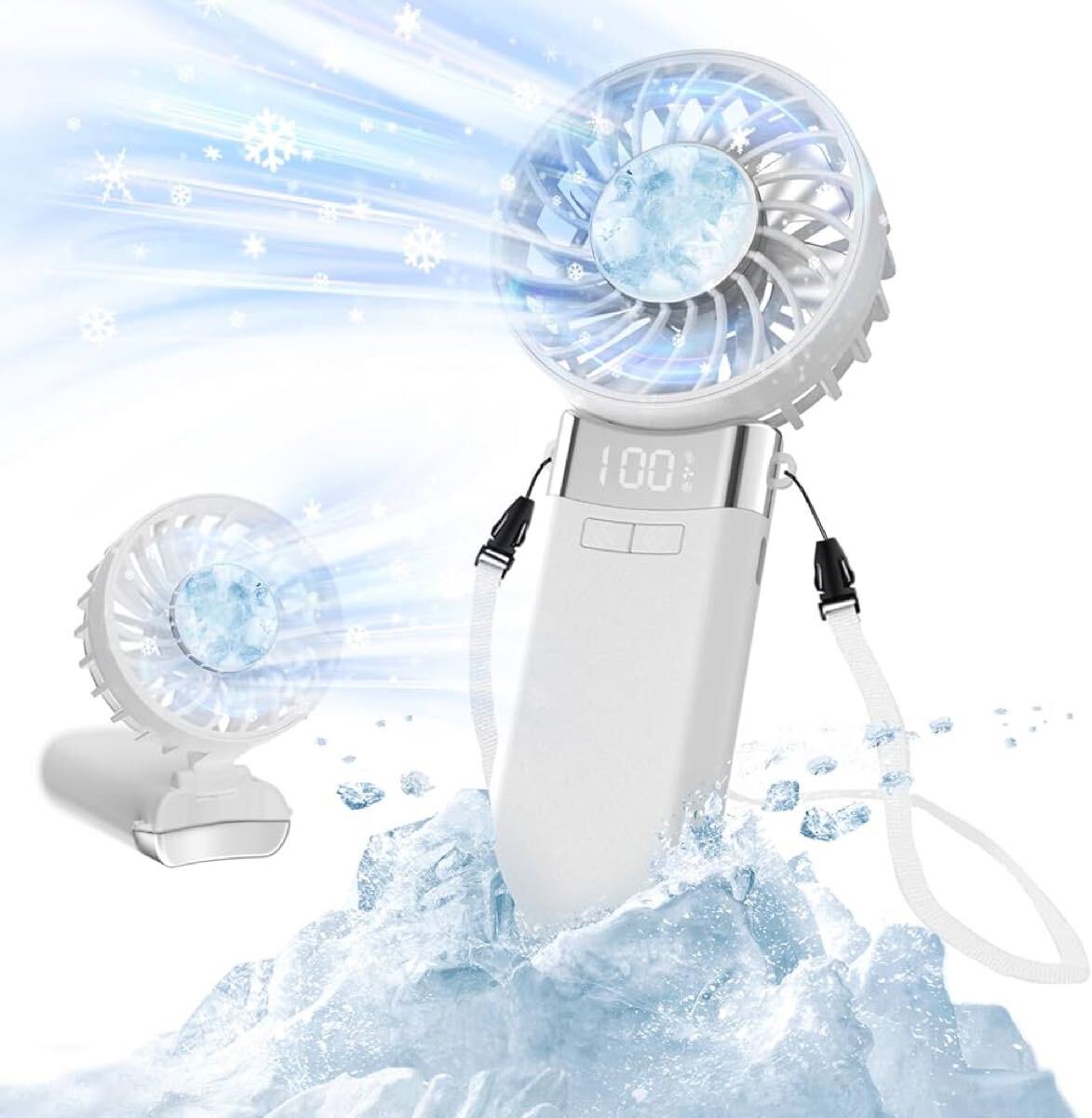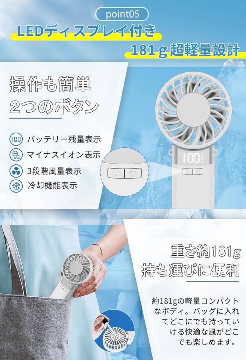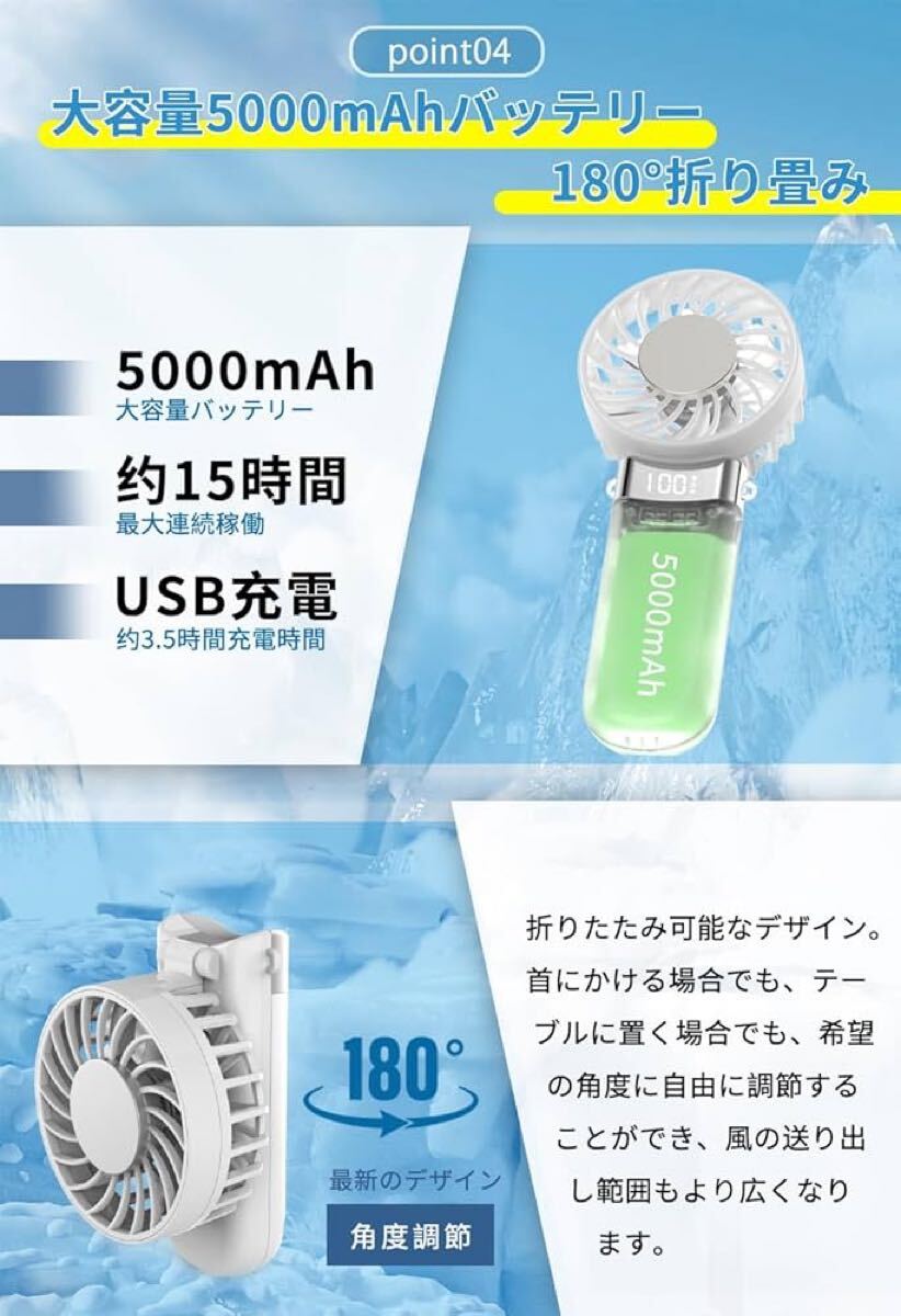 一般的な携帯扇風機の約2倍の容量で、弱風モードなら最長15時間使用可能。LEDディスプレイでバッテリー残量や機能を確認でき、Type-C急速充電対応(約3時間で満充電)。外出先でも安心。