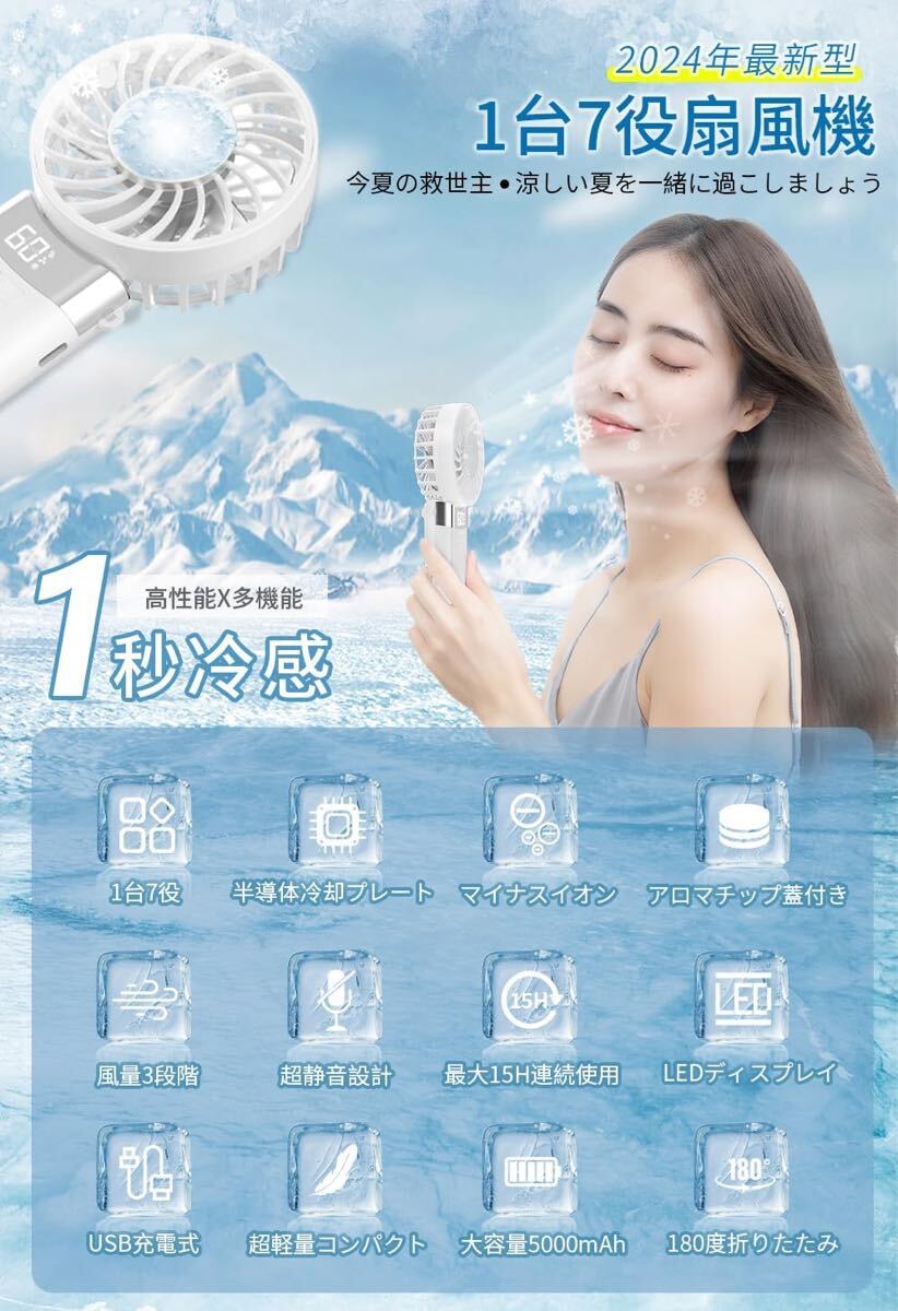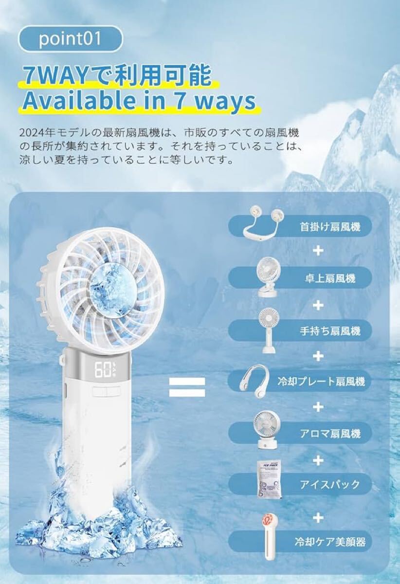 首掛け・手持ち・卓上の3WAYに加え、冷却機能、アロマ対応、アイスパック、美顔冷却まで使える多機能ハンディファン。400万個のマイナスイオンで空気をリフレッシュし、真夏の熱中症対策にも最適です。